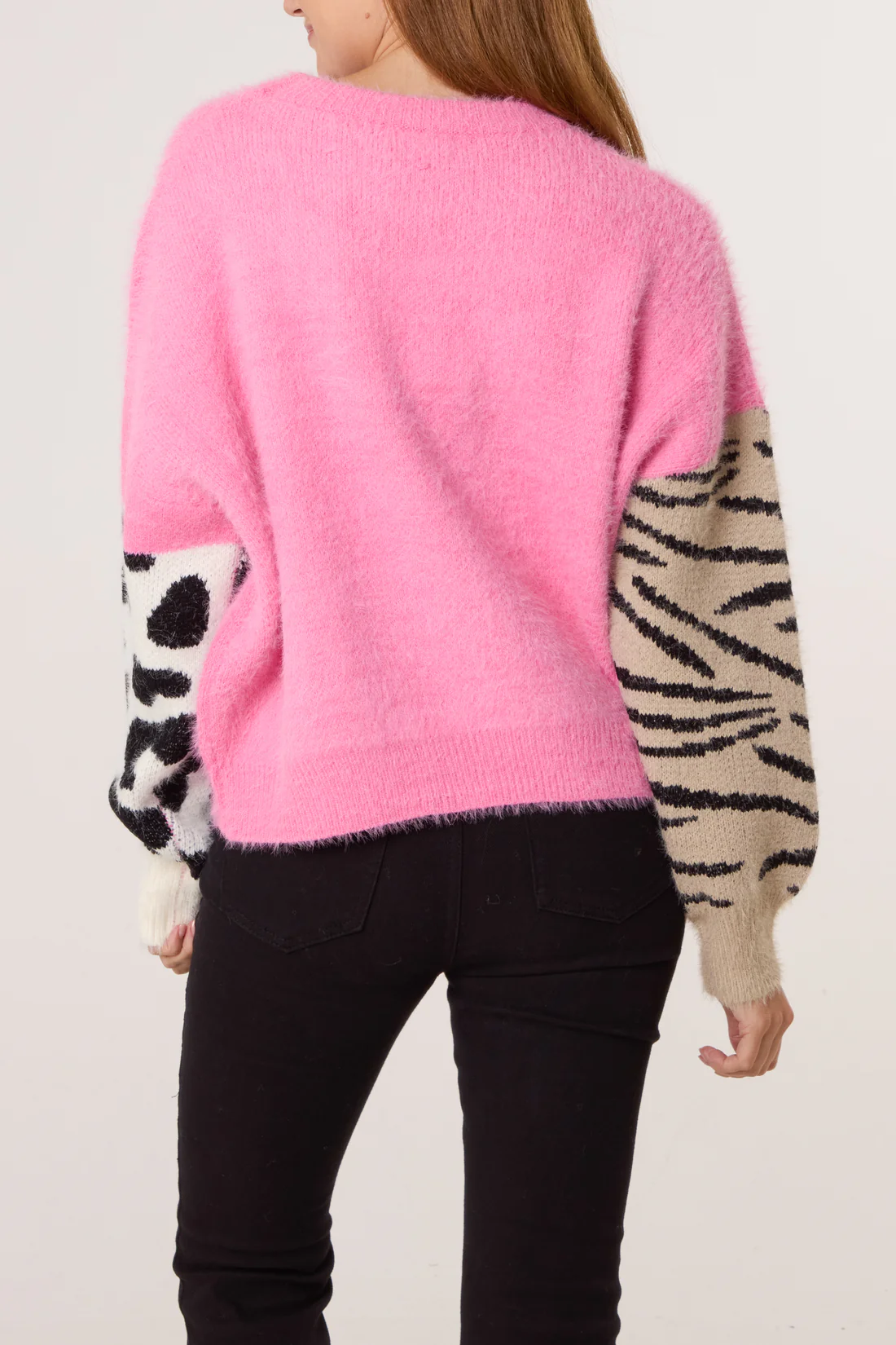 Soft multi animal print mix jumper featuring round neckline & print to front and back.