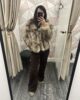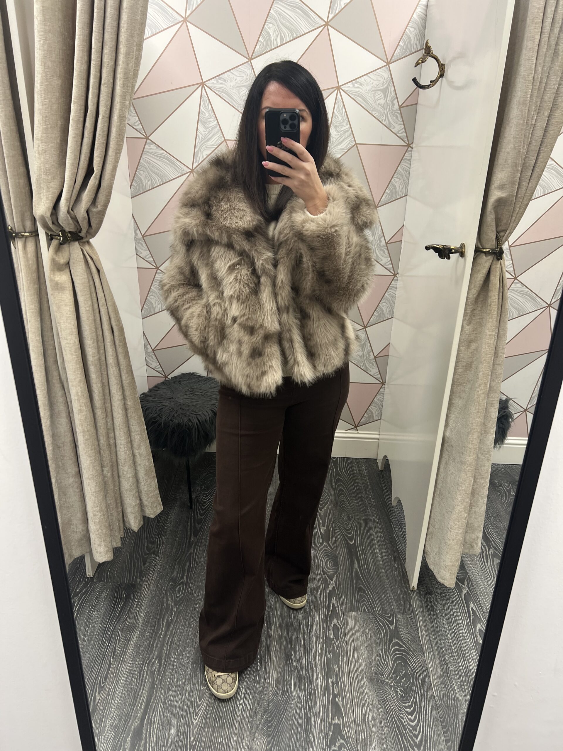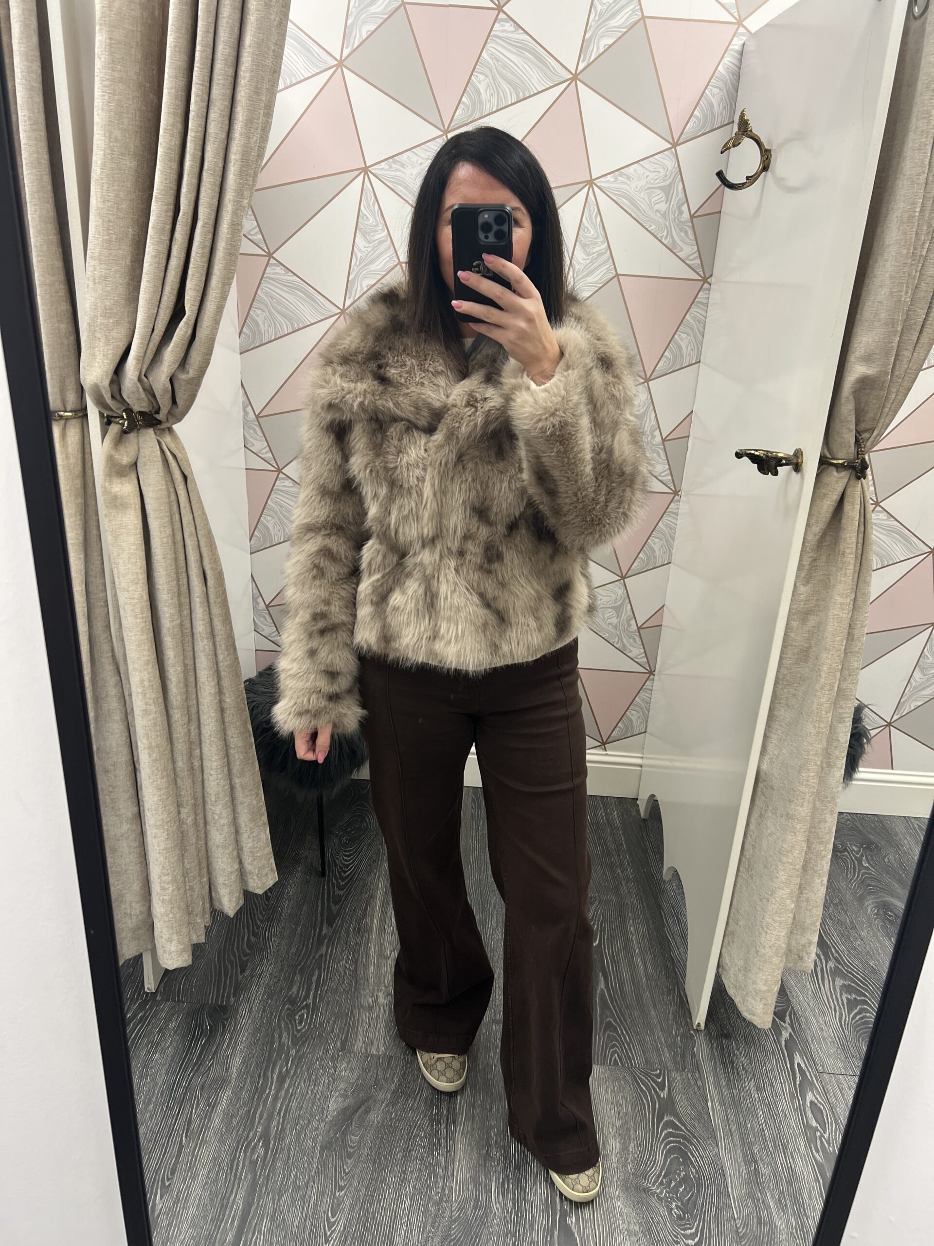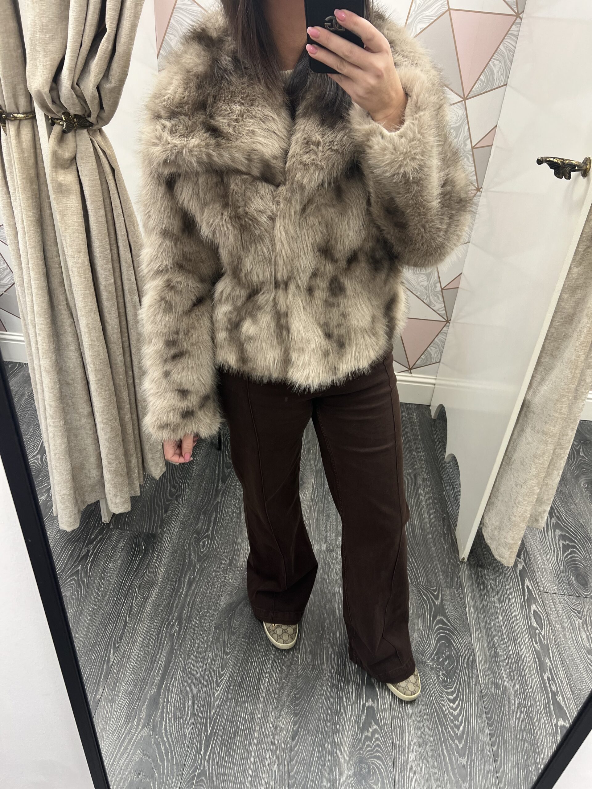 New season faded faux fur coat featuring collar, button front fastening & pockets.
