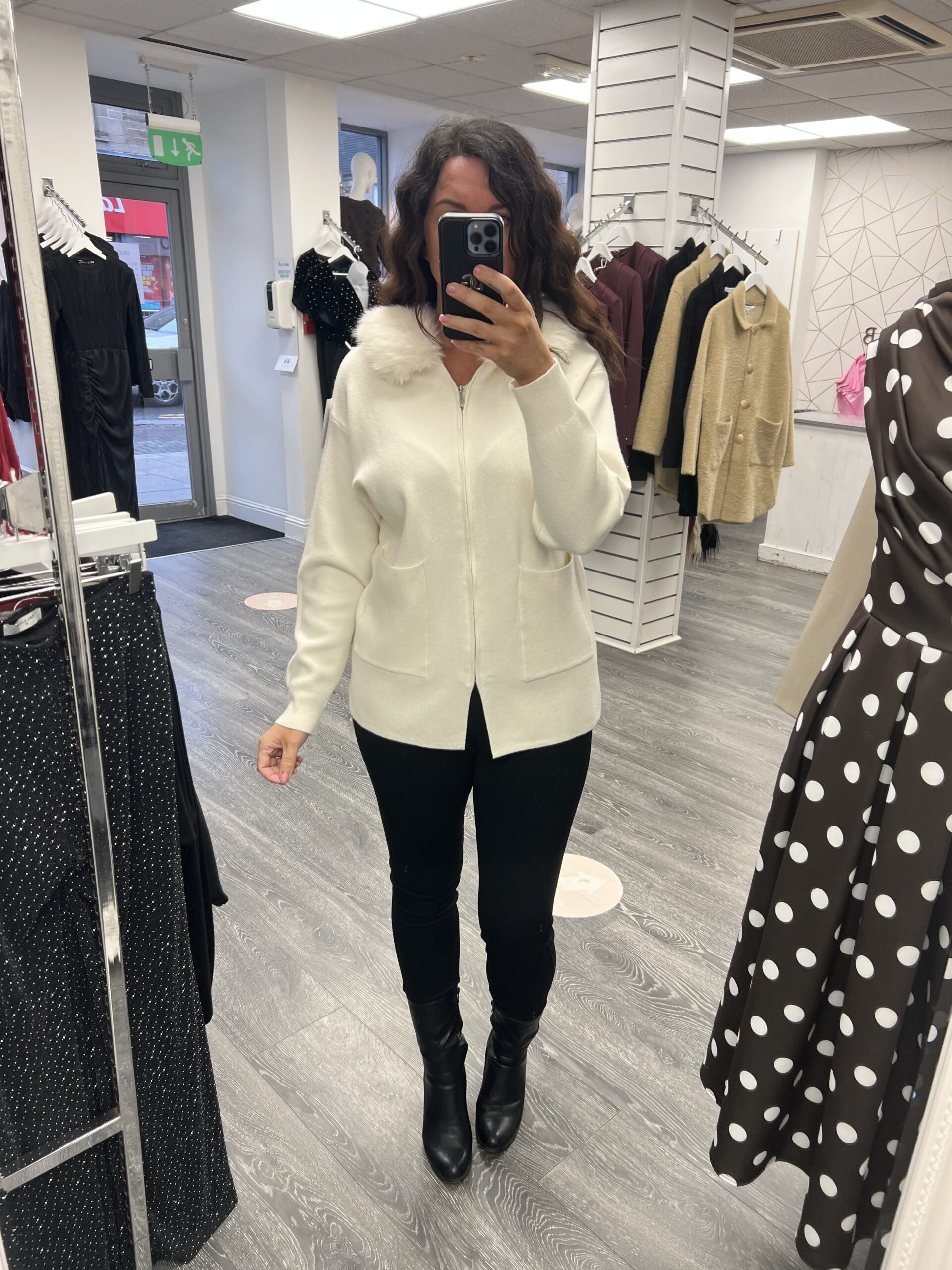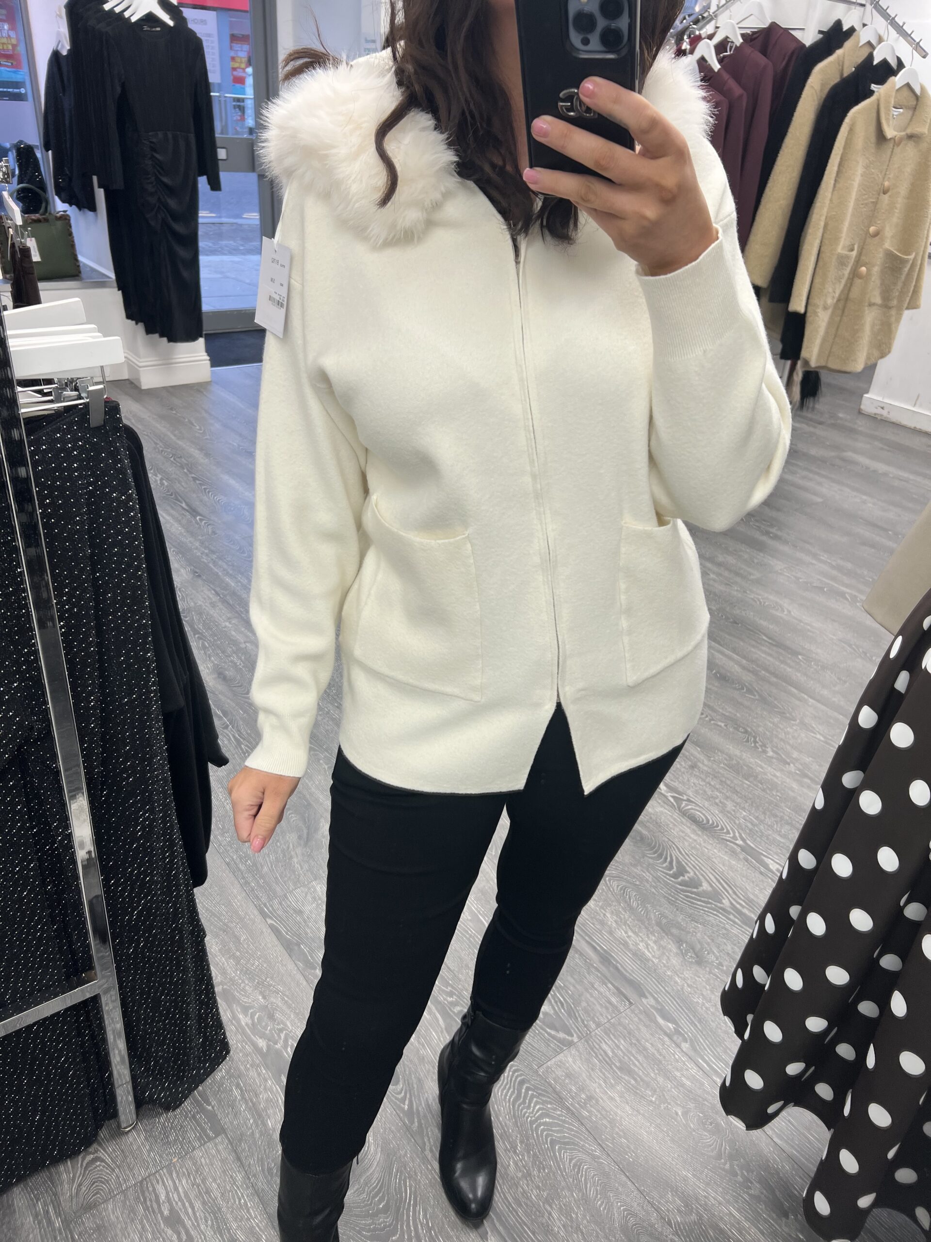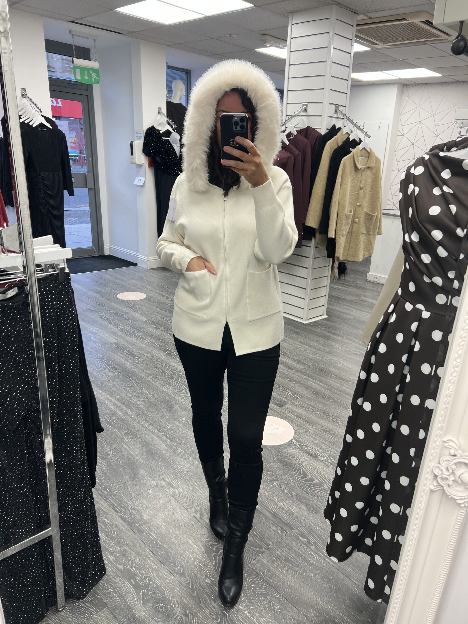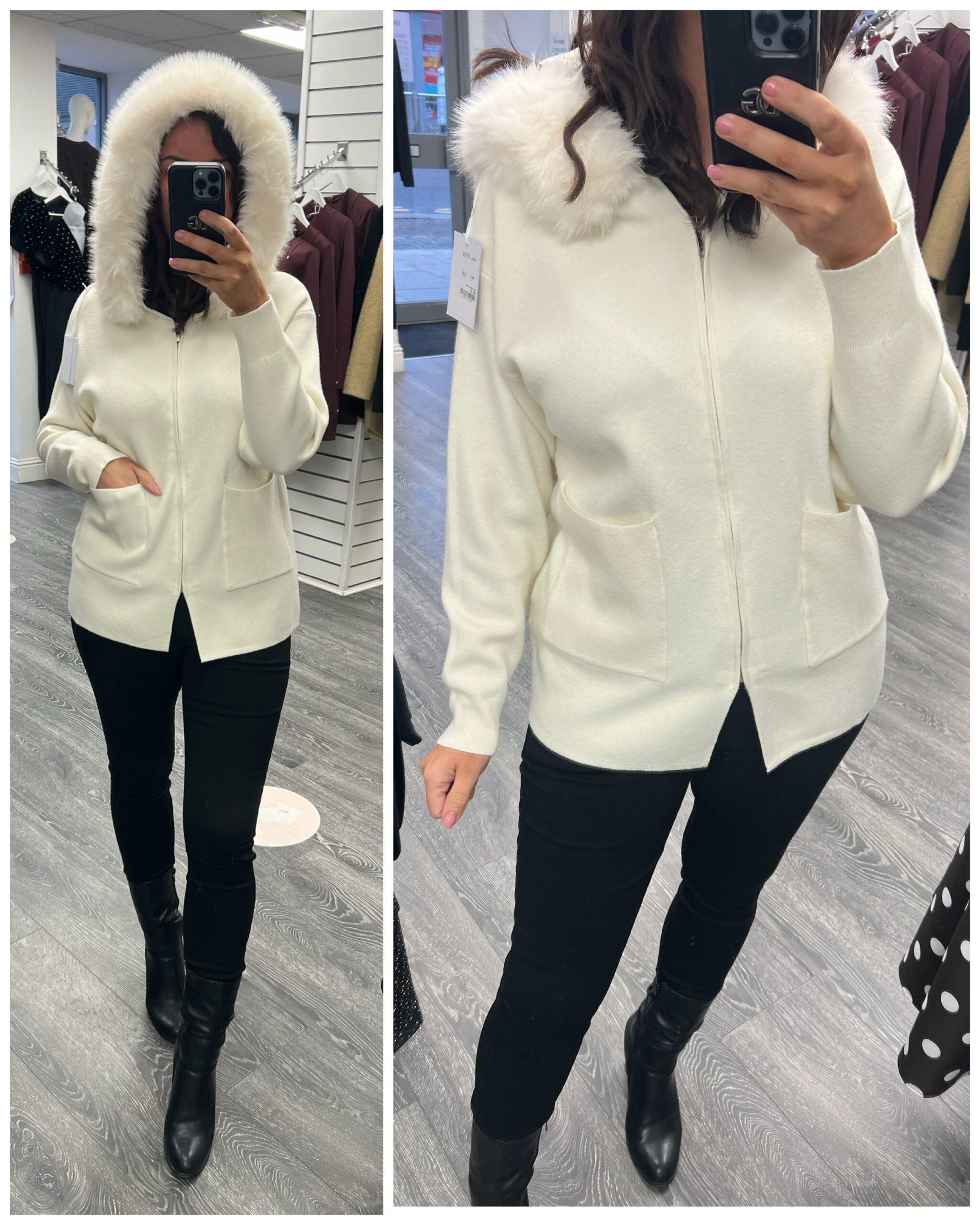 New season super soft high quality knitwear featuring zip front fastening, pockets and removable faux fur trim hood.