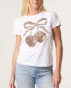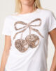 New season white cap sleeve, round neckline tee featuring embellished animal print cherries to front. Plane to back.