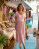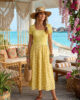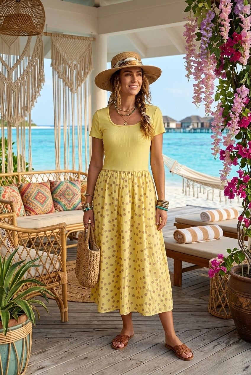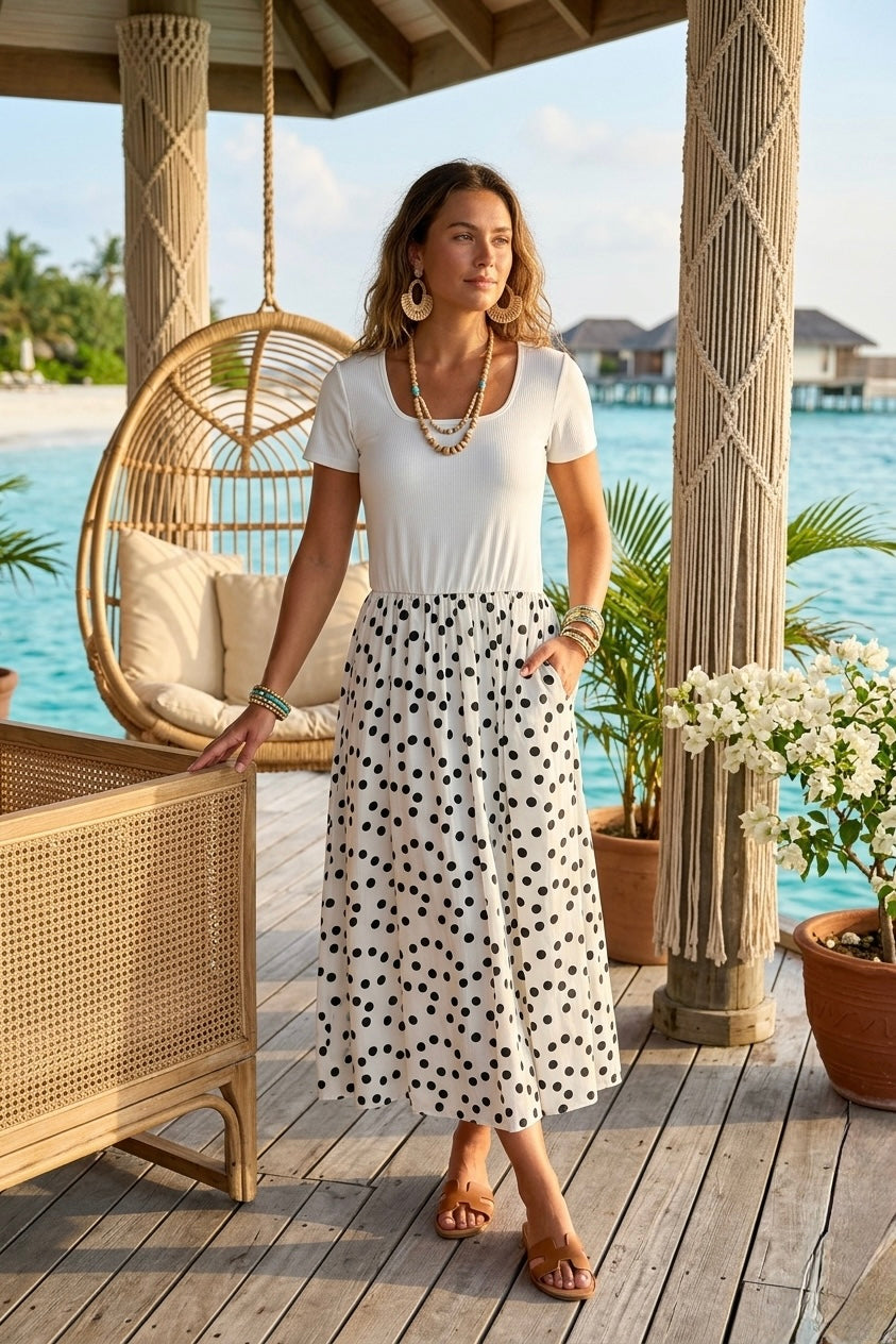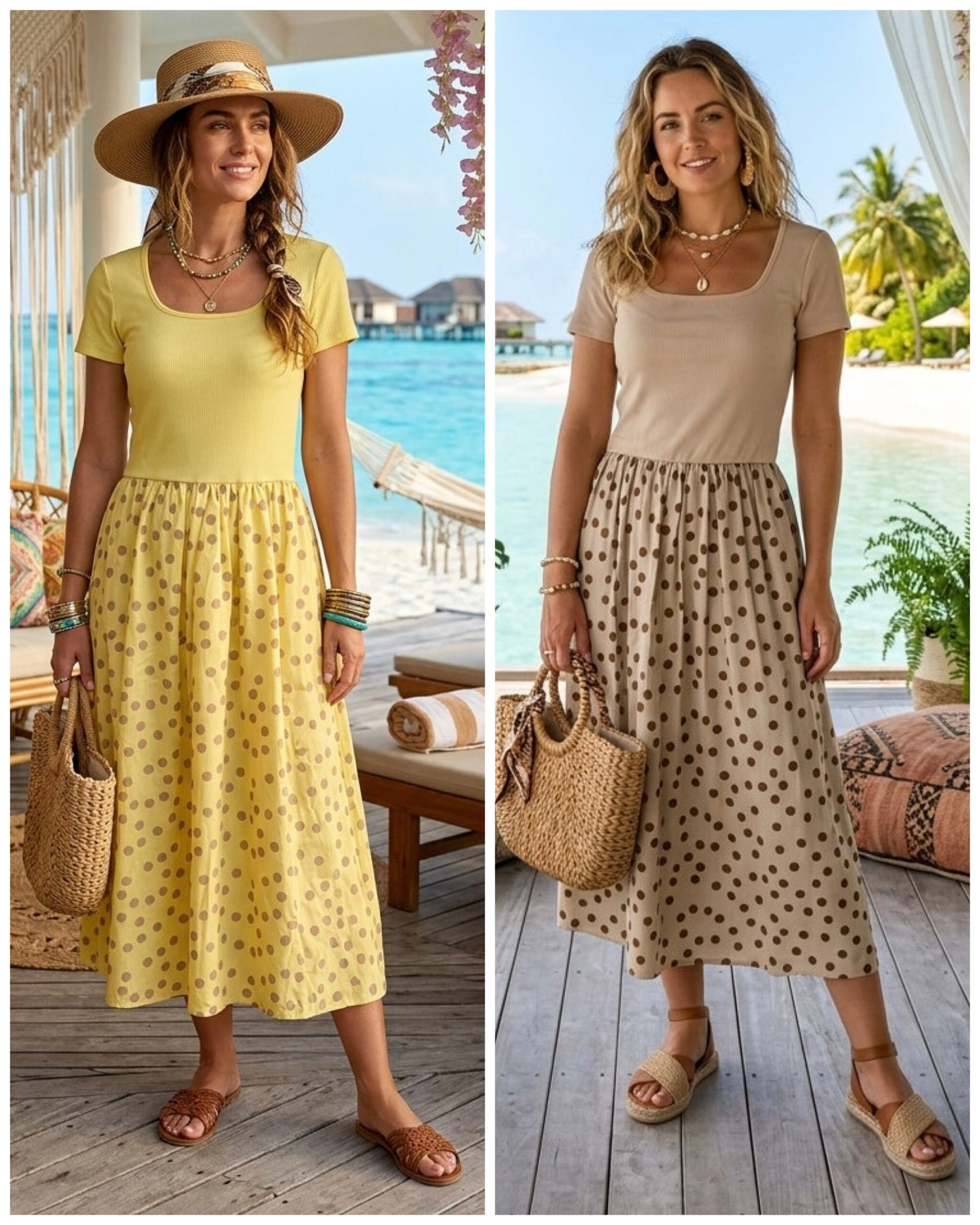 New season t-shirt spotted midi dress featuring square neckline, pockets & polka dots. Available in beige, white, pink, blue & lemon.
