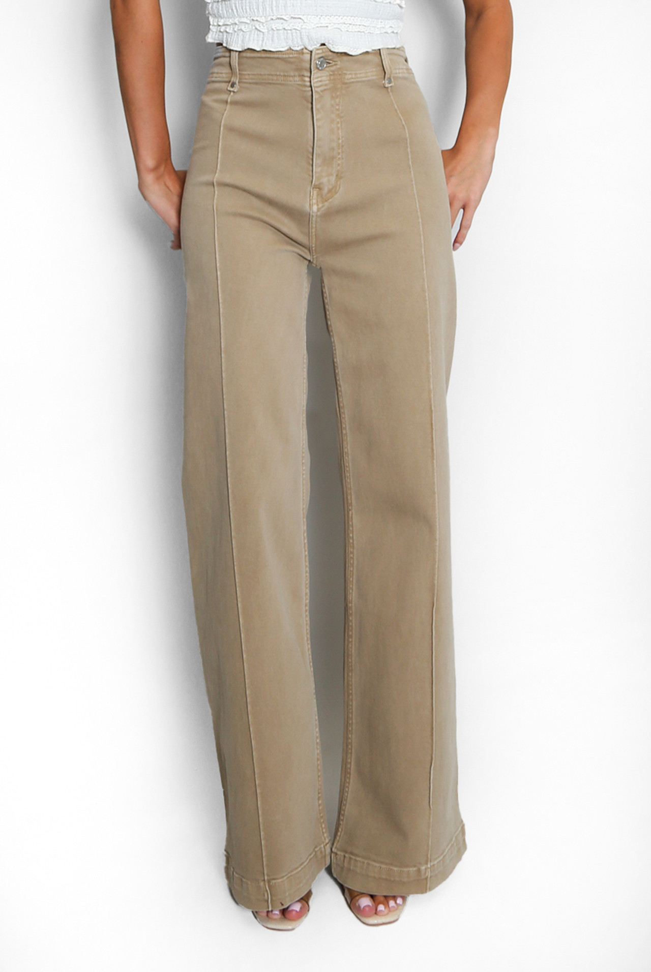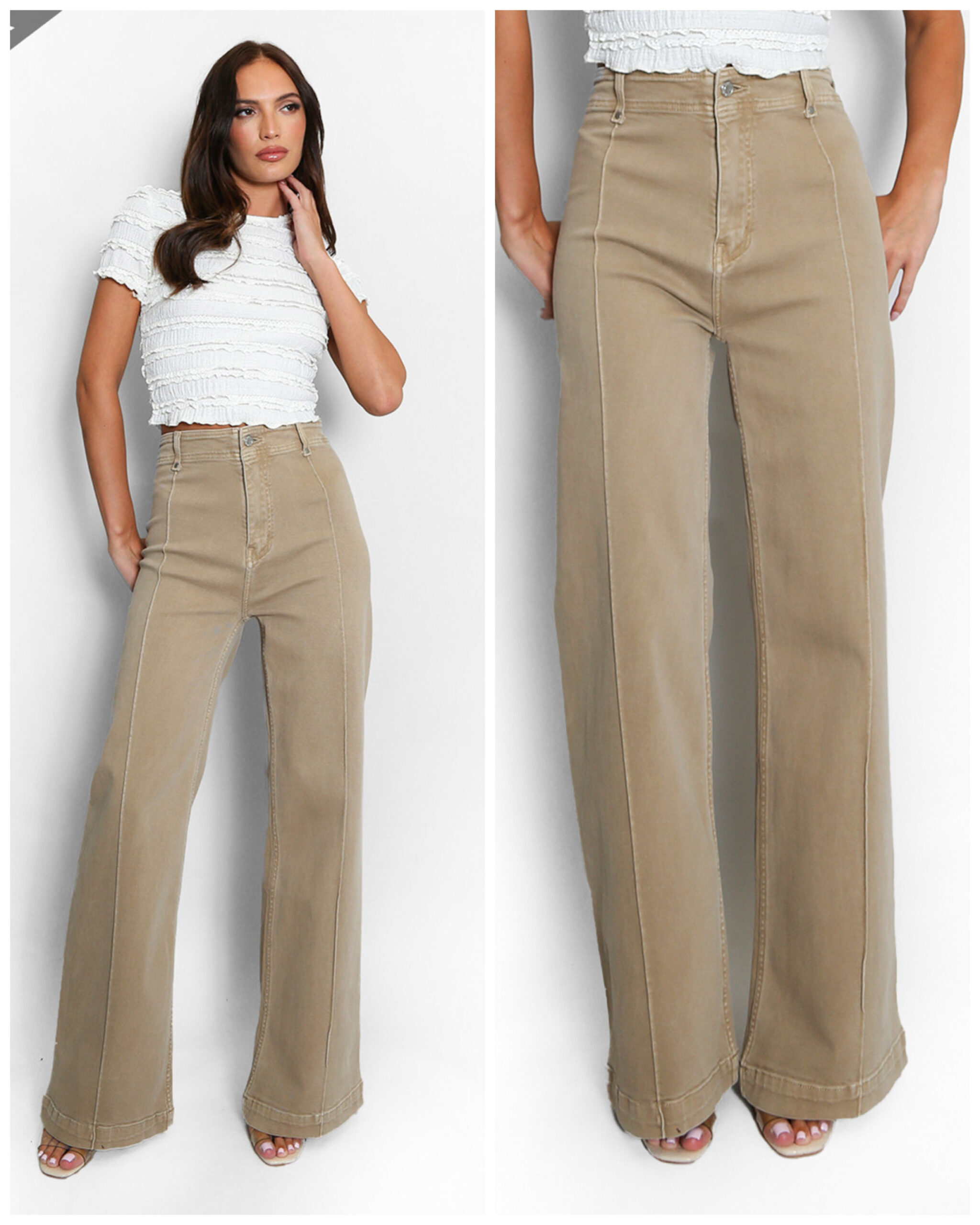New season taupe visible seam wide leg jeans featuring high rise waistband, back pockets, button & zip front fastening.