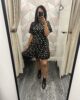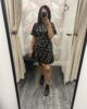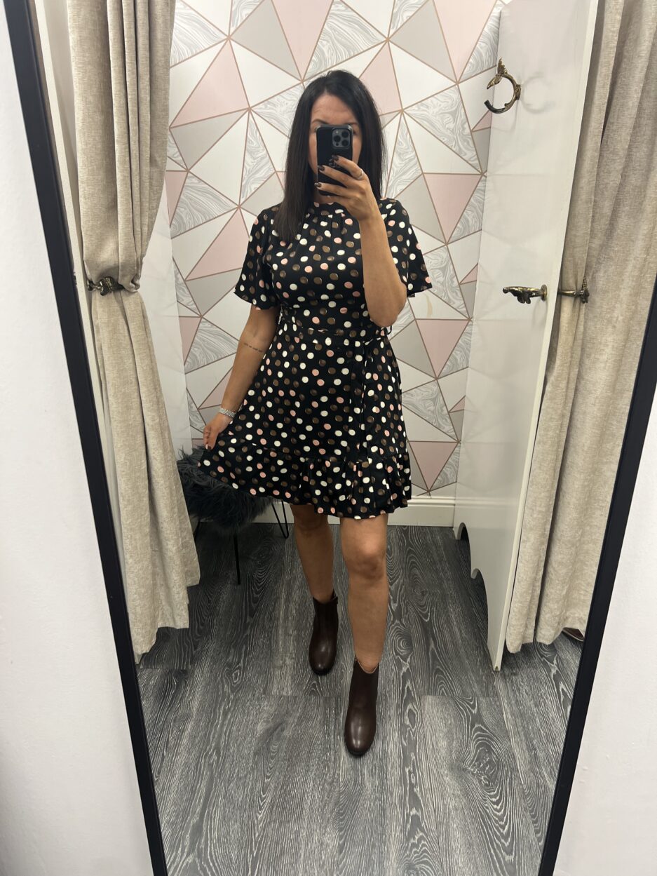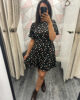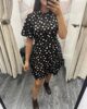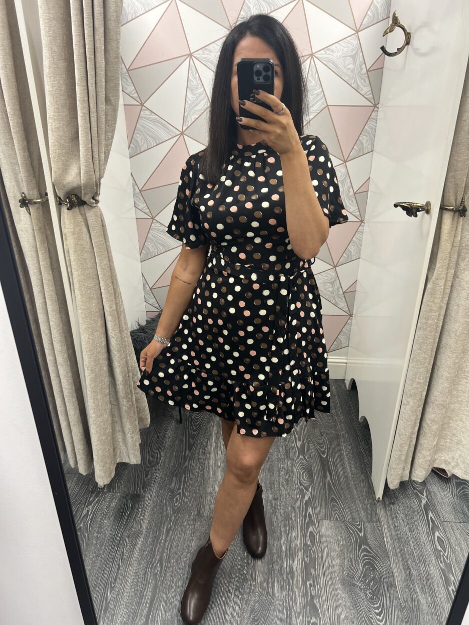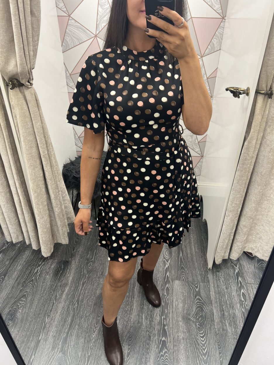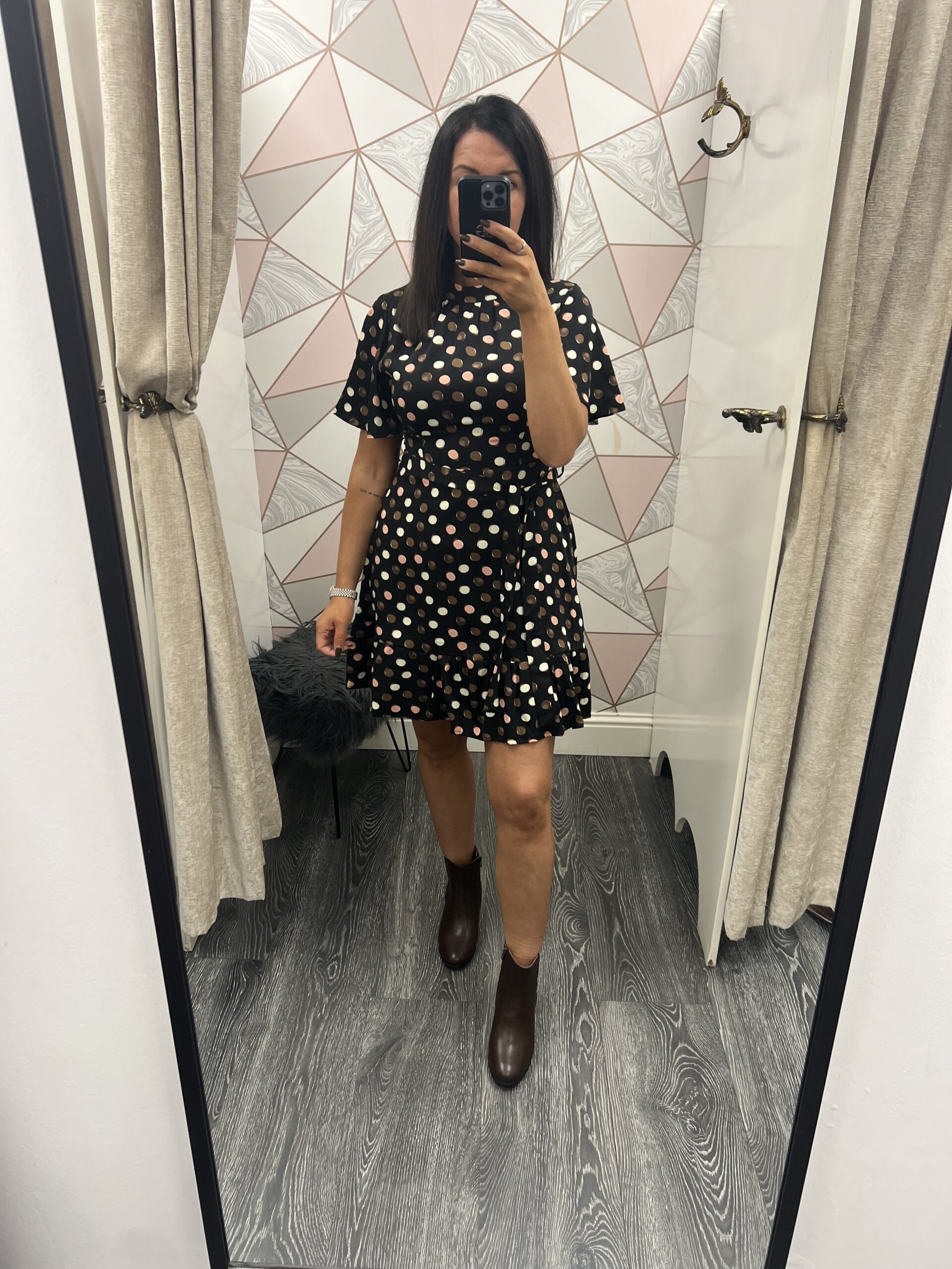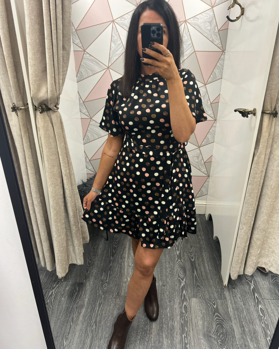 New season polka dot mini dress featuring short flute sleeve, self tie to waist which can be tied to front or back. Zip back fastening & colourful polka dot print all over. Fully lined. This style runs true to size.