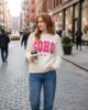 New season super soft knitted long sleeved crew neck jumper in a wool blended fabric with vibrant Soho New York front slogan. Ivory with hot pink slogan.