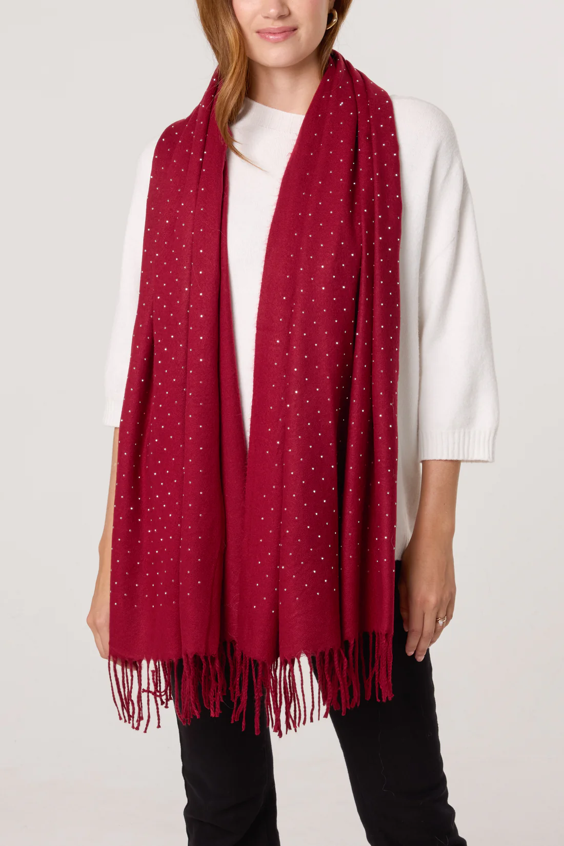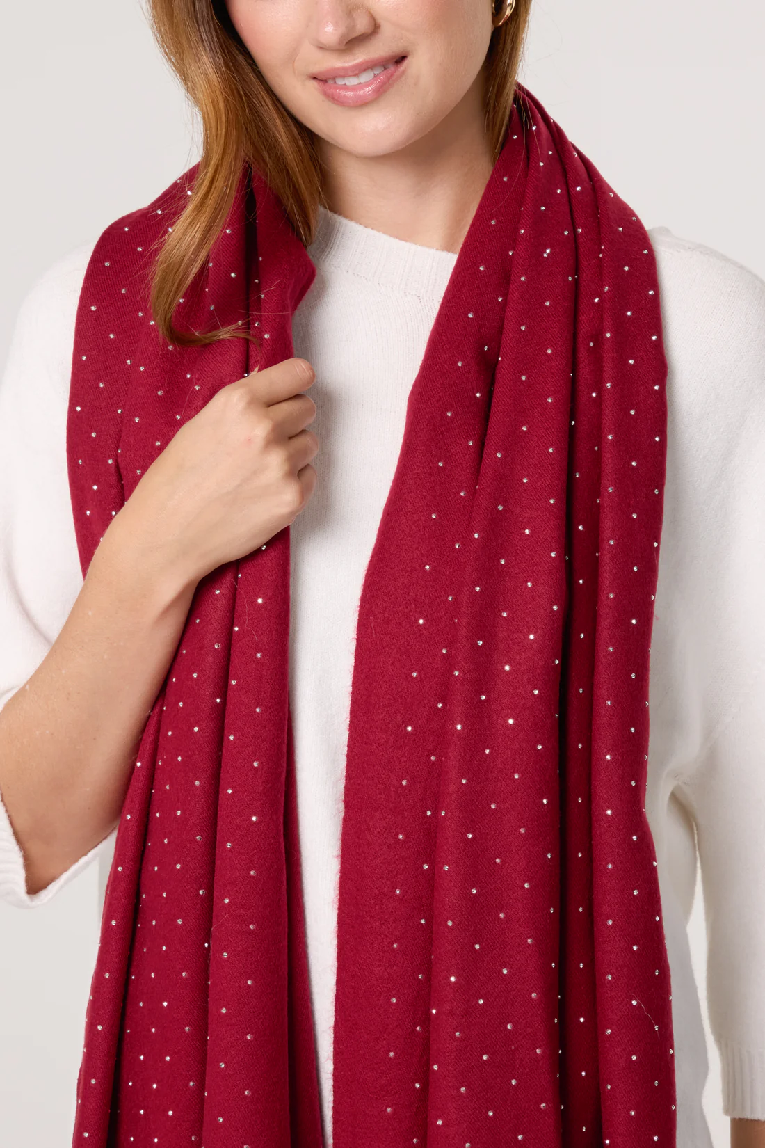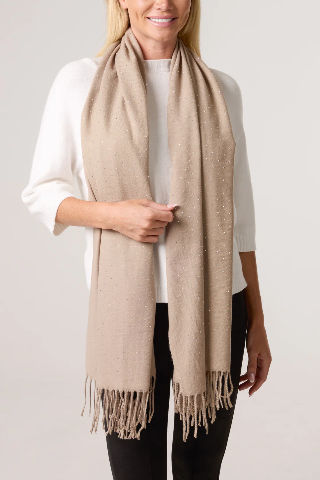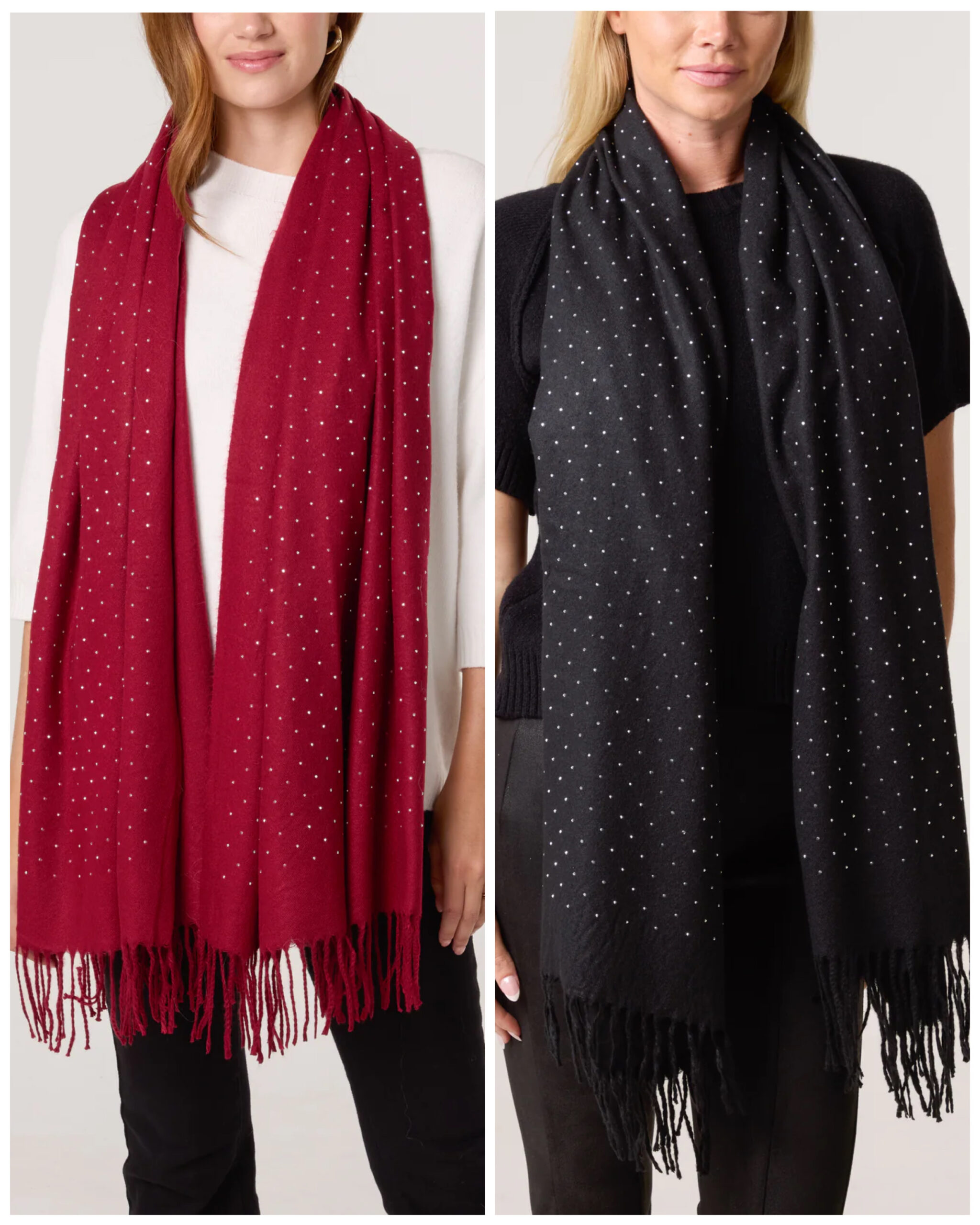 New season sparkle soft scarf featuring embellishment to outside. Available in mocha, black, wine & grey.