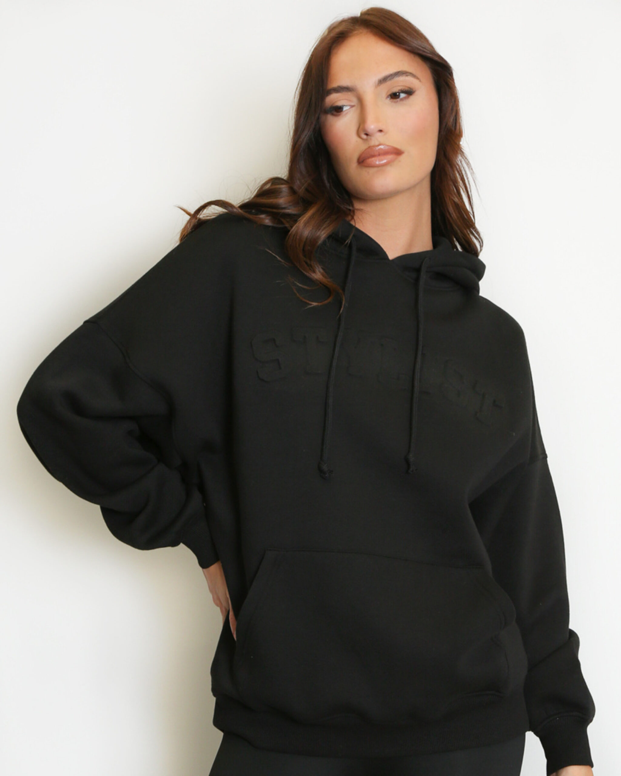 Cosy oversized hoodie featuring “stylist” slogan to front, cuff sleeve and elasticated trim.