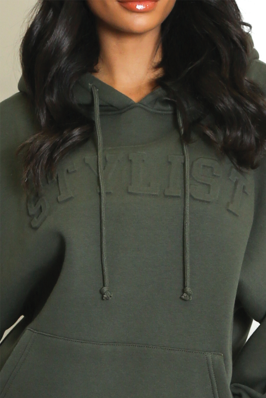 Cosy oversized hoodie featuring “stylist” slogan to front, cuff sleeve and elasticated trim.