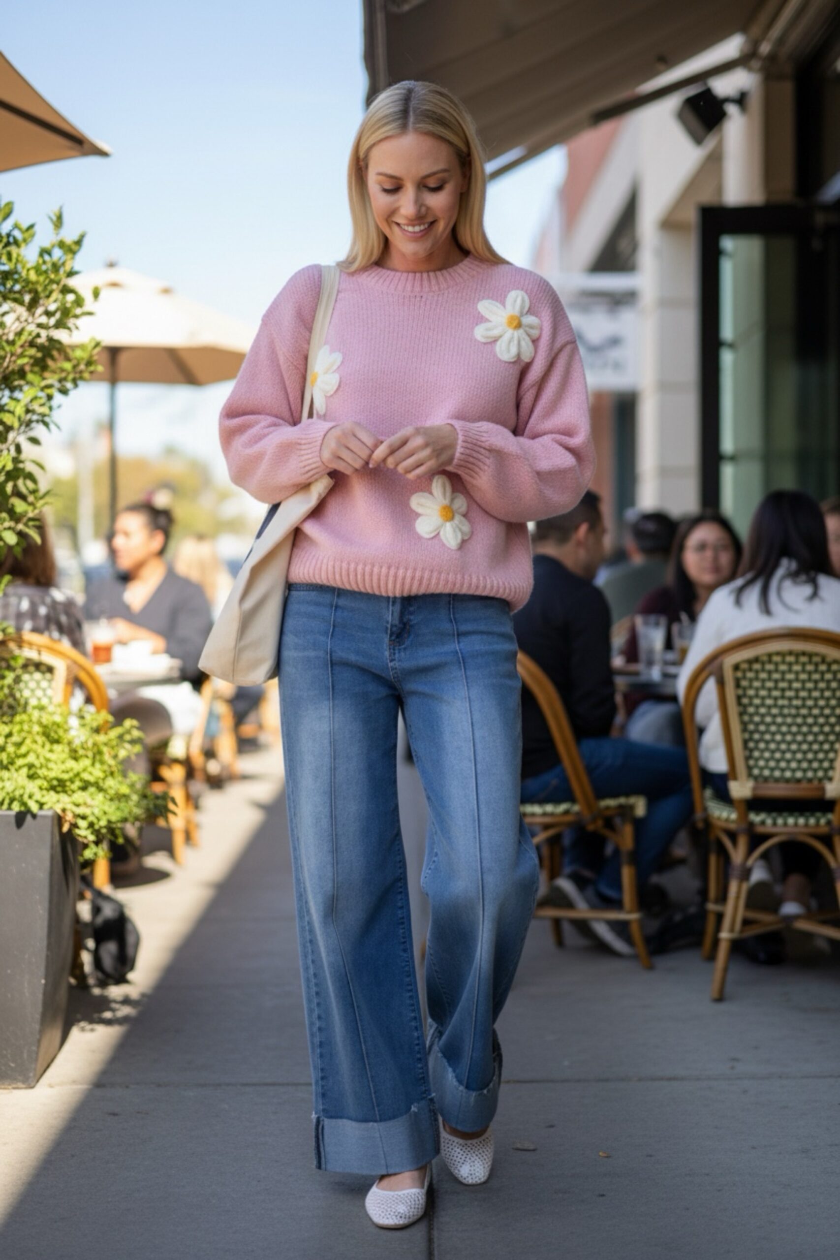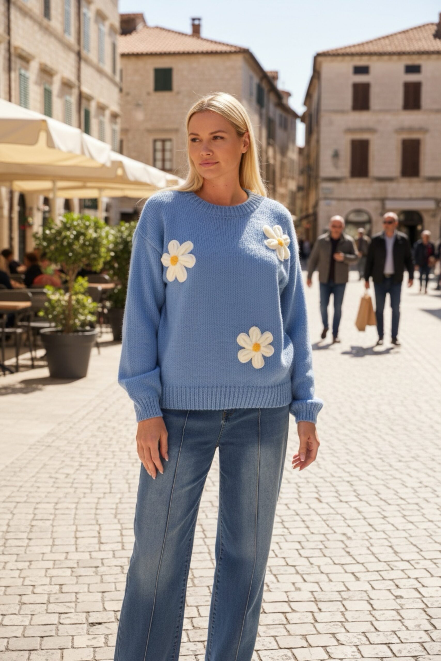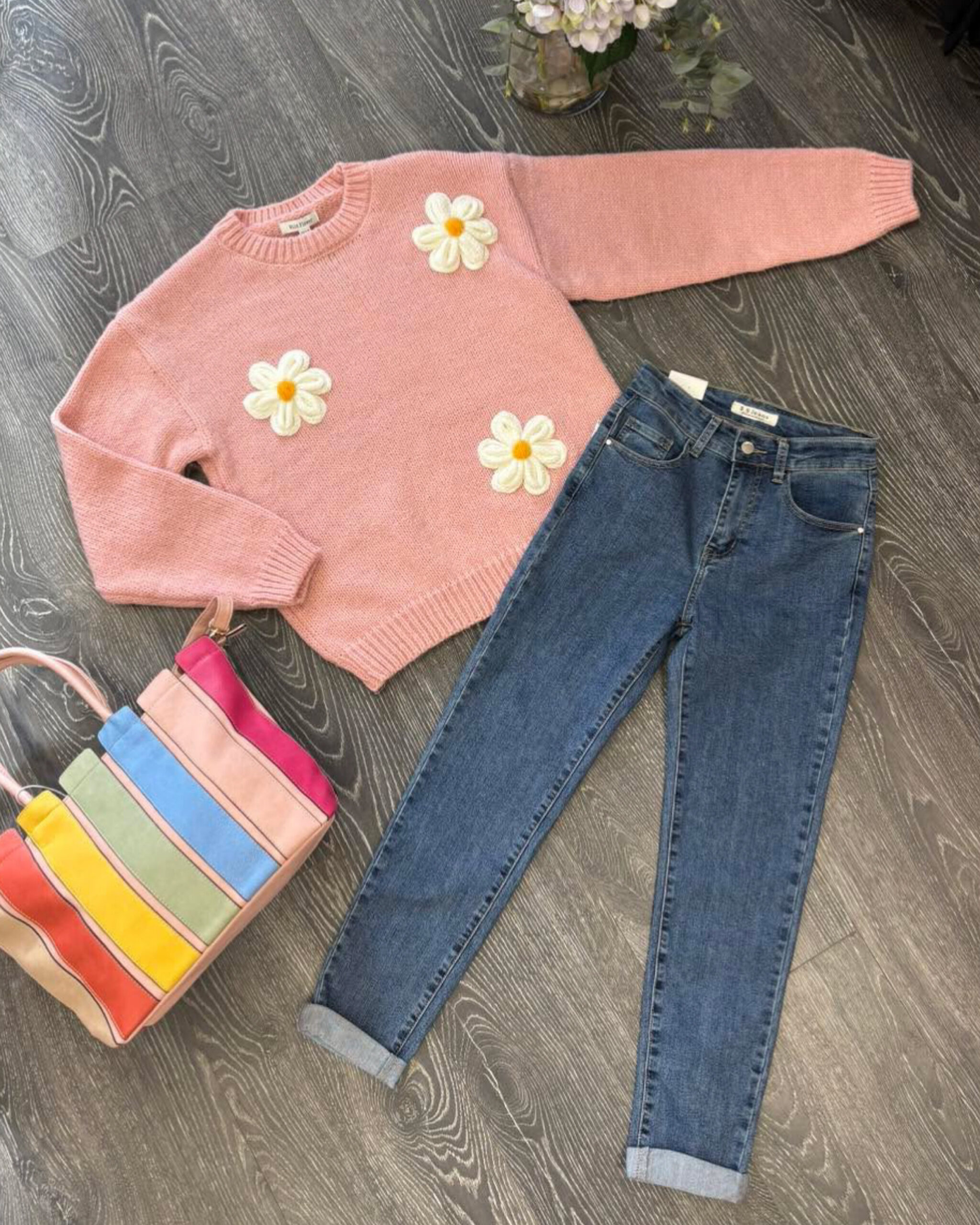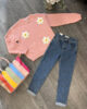 Trending flower crochet knitwear. Jumper makes the perfect transitional wardrobe go to. Available in blue & pink.