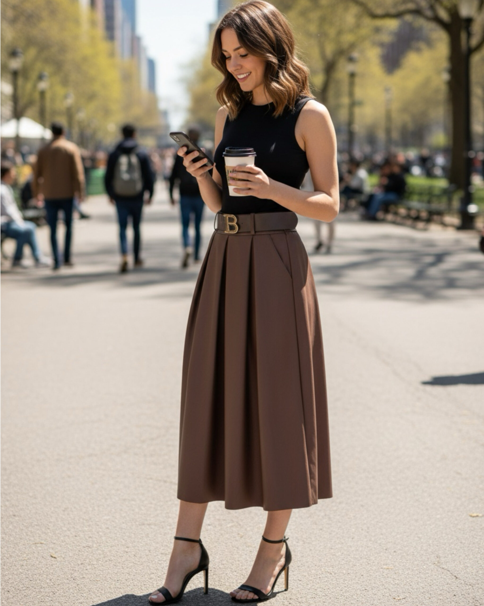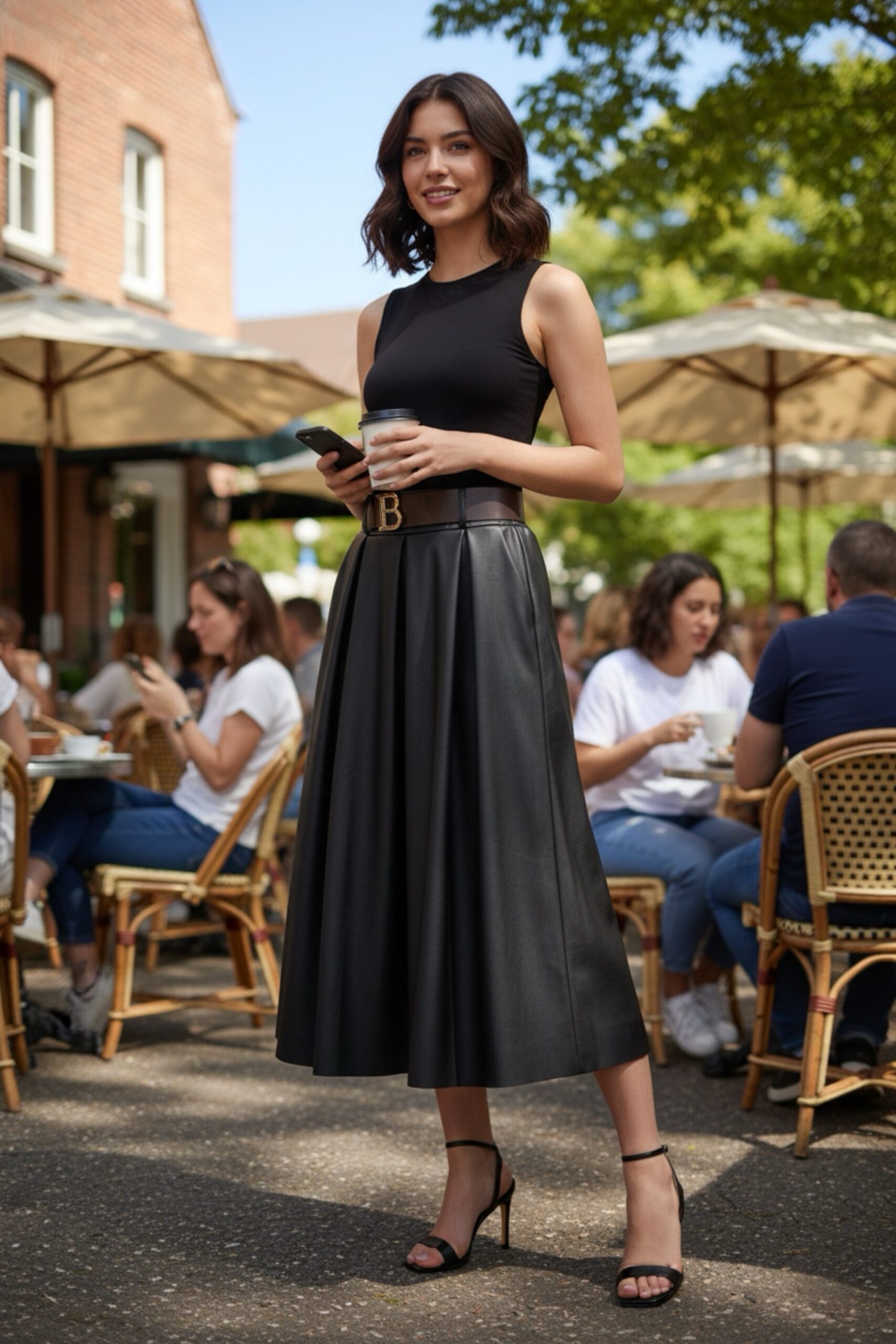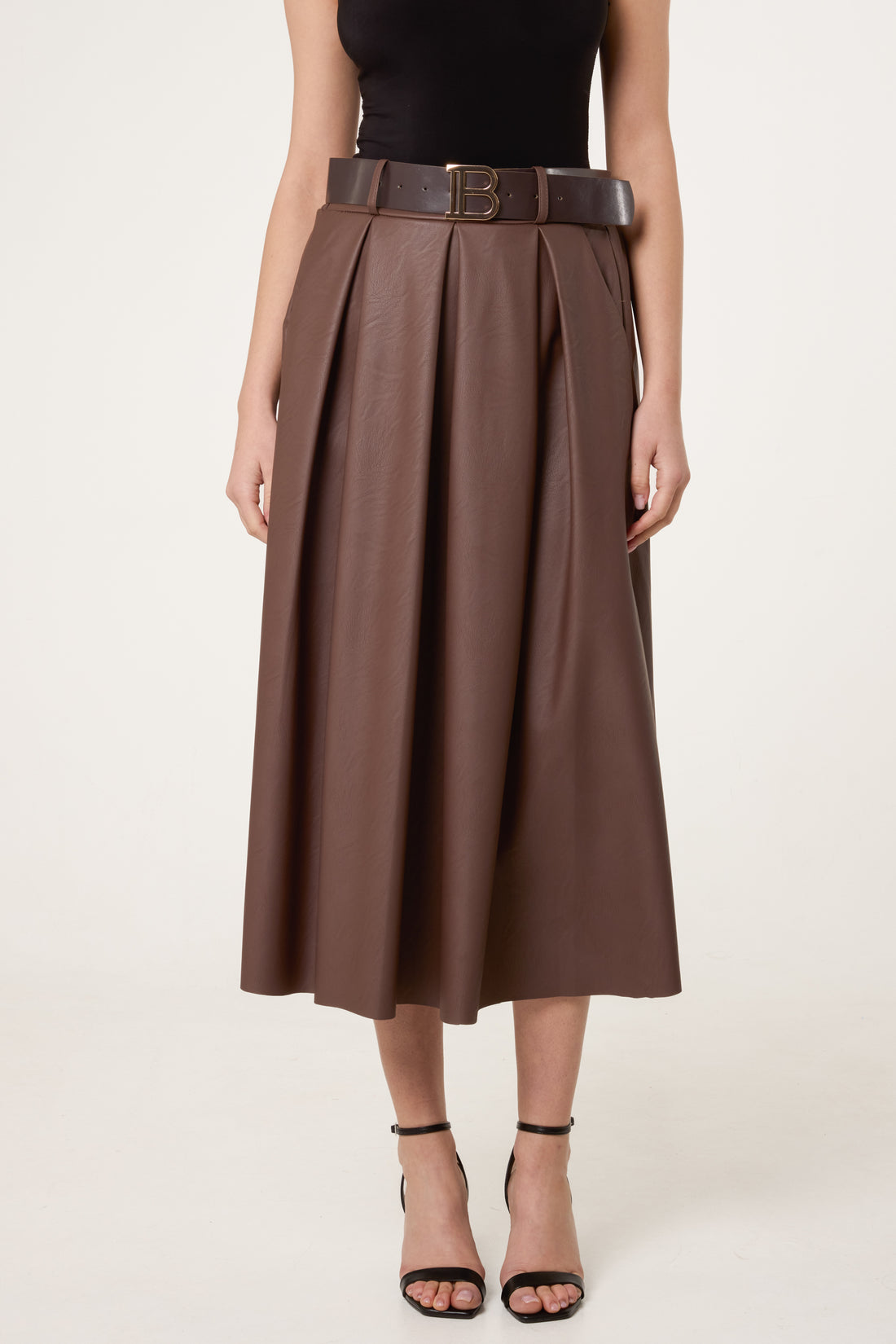 Soft faux leather midi skirt featuring elasticated waistband, belt & pockets.