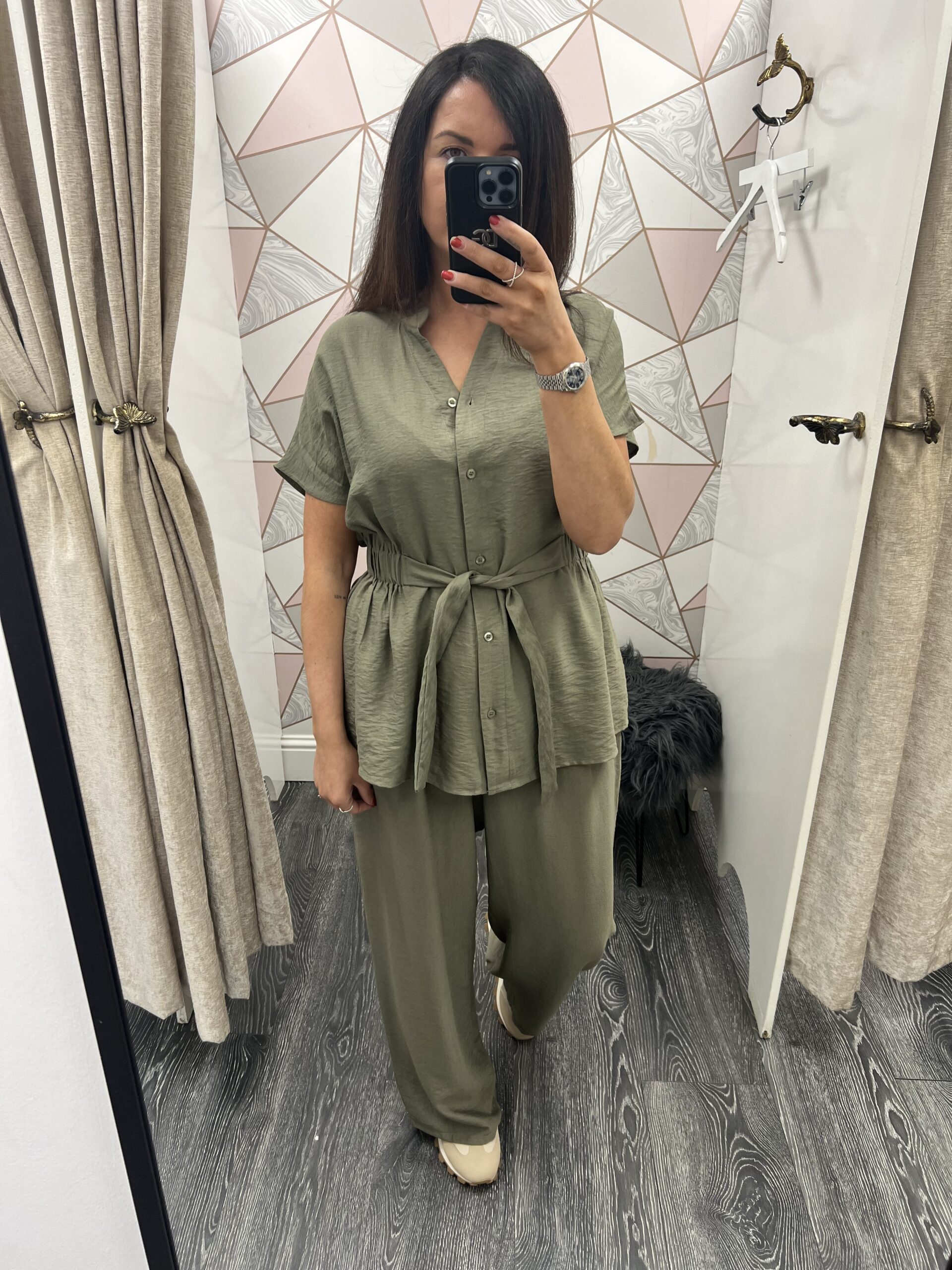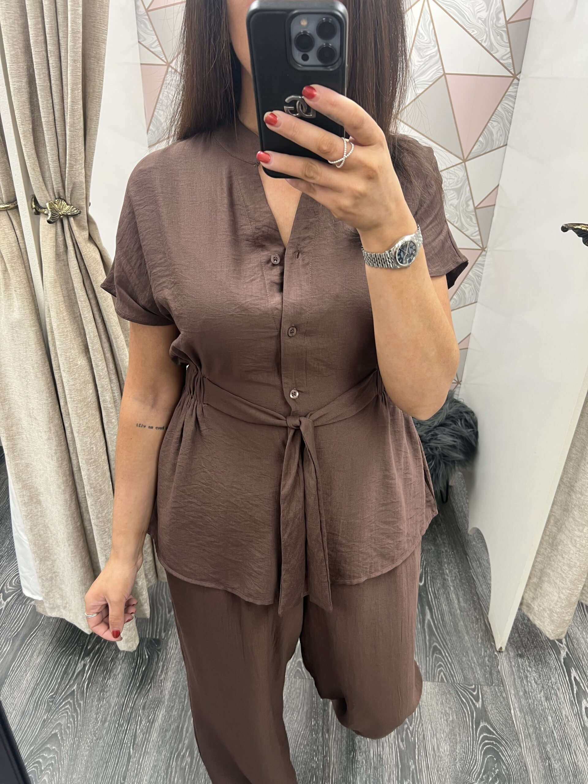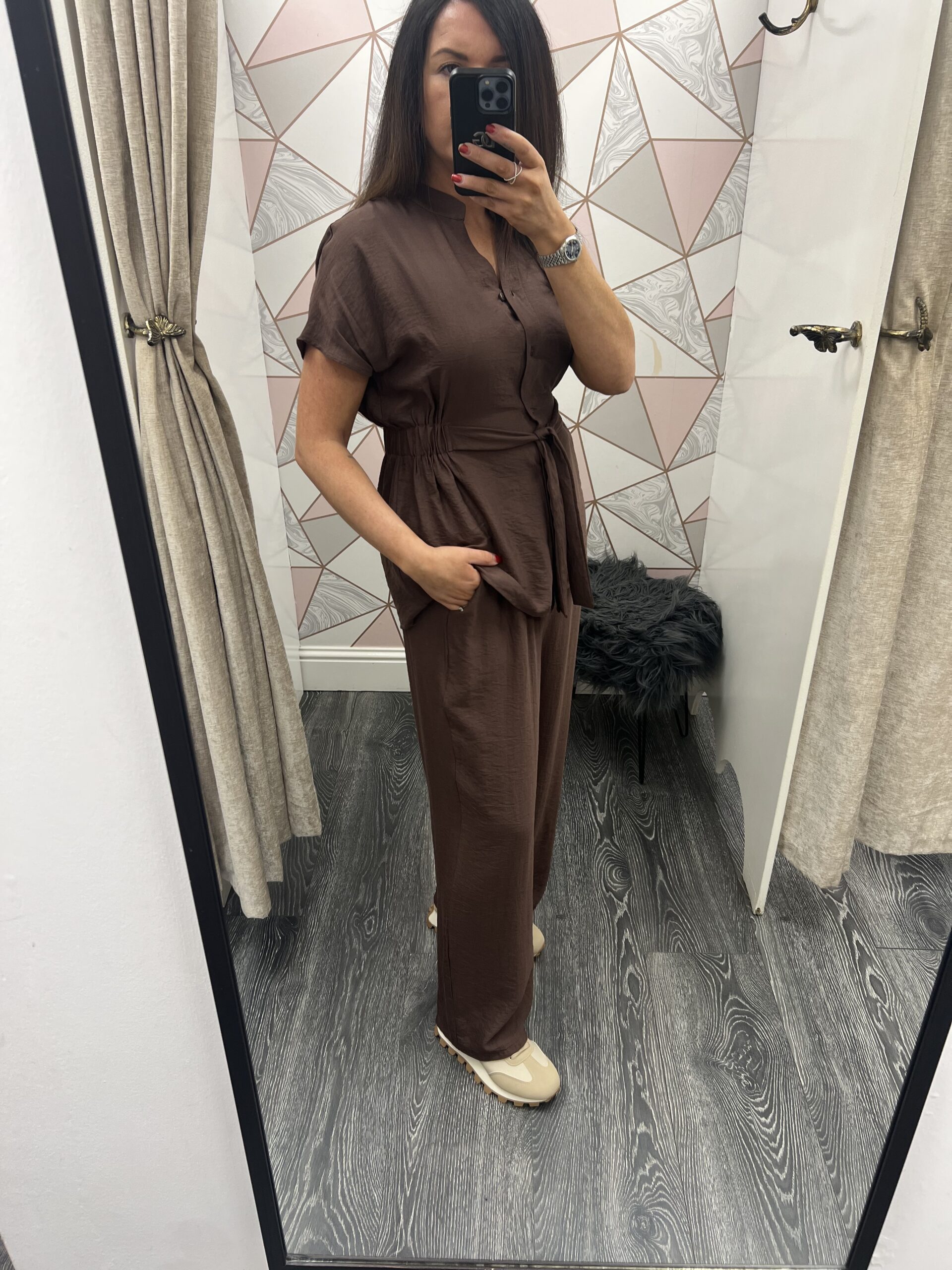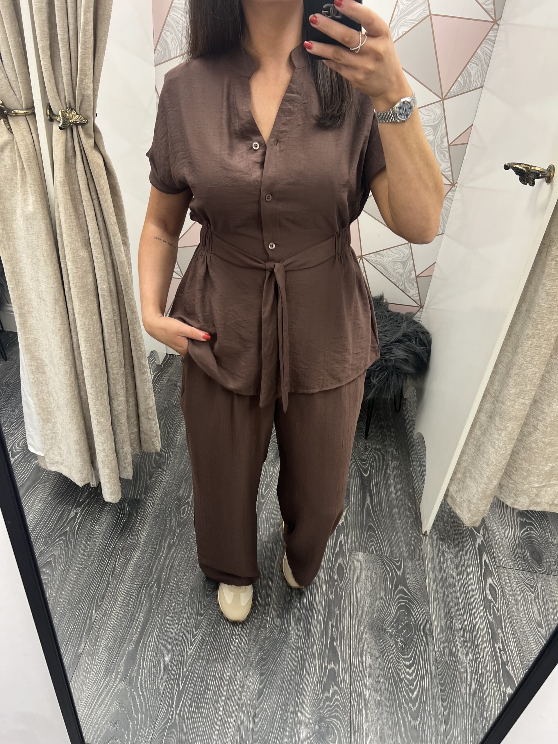 New season co ord available in chocolate, beige & khaki. Top features button front fastening, cap sleeves, collar & belted waistband (elasticated to back) for a comfortable fit. Trousers feature an elasticated waistband & pockets – Inside Leg