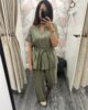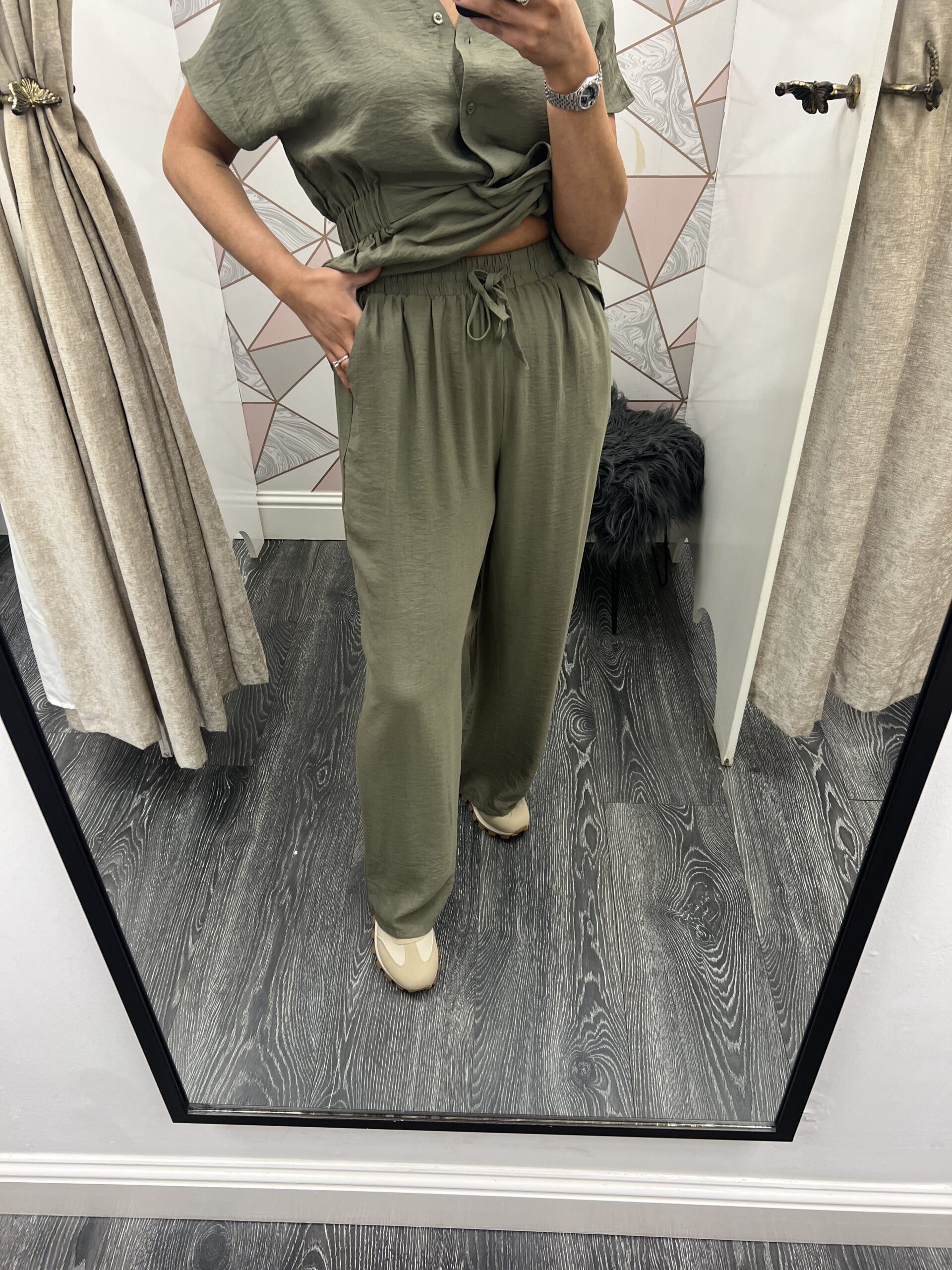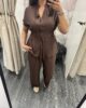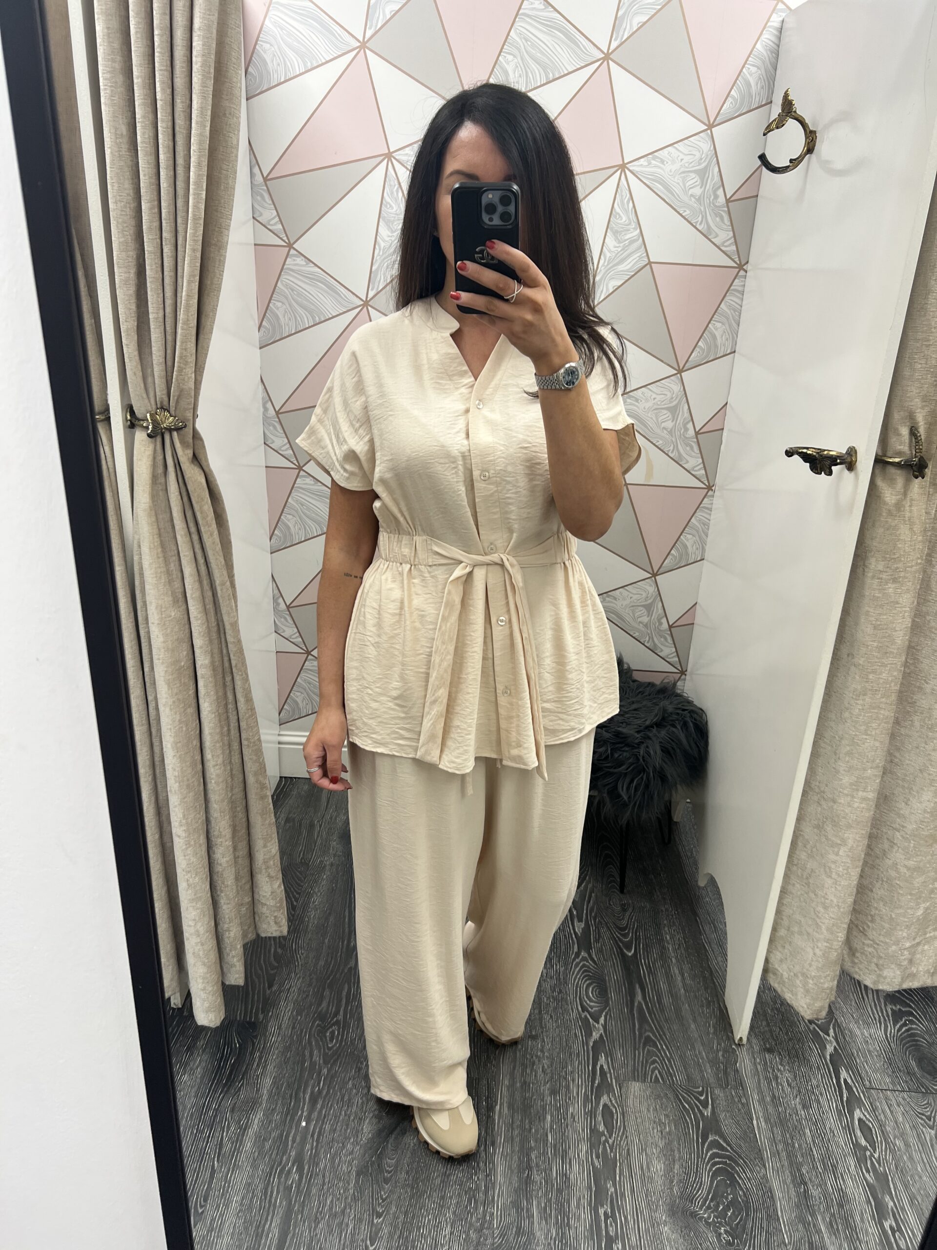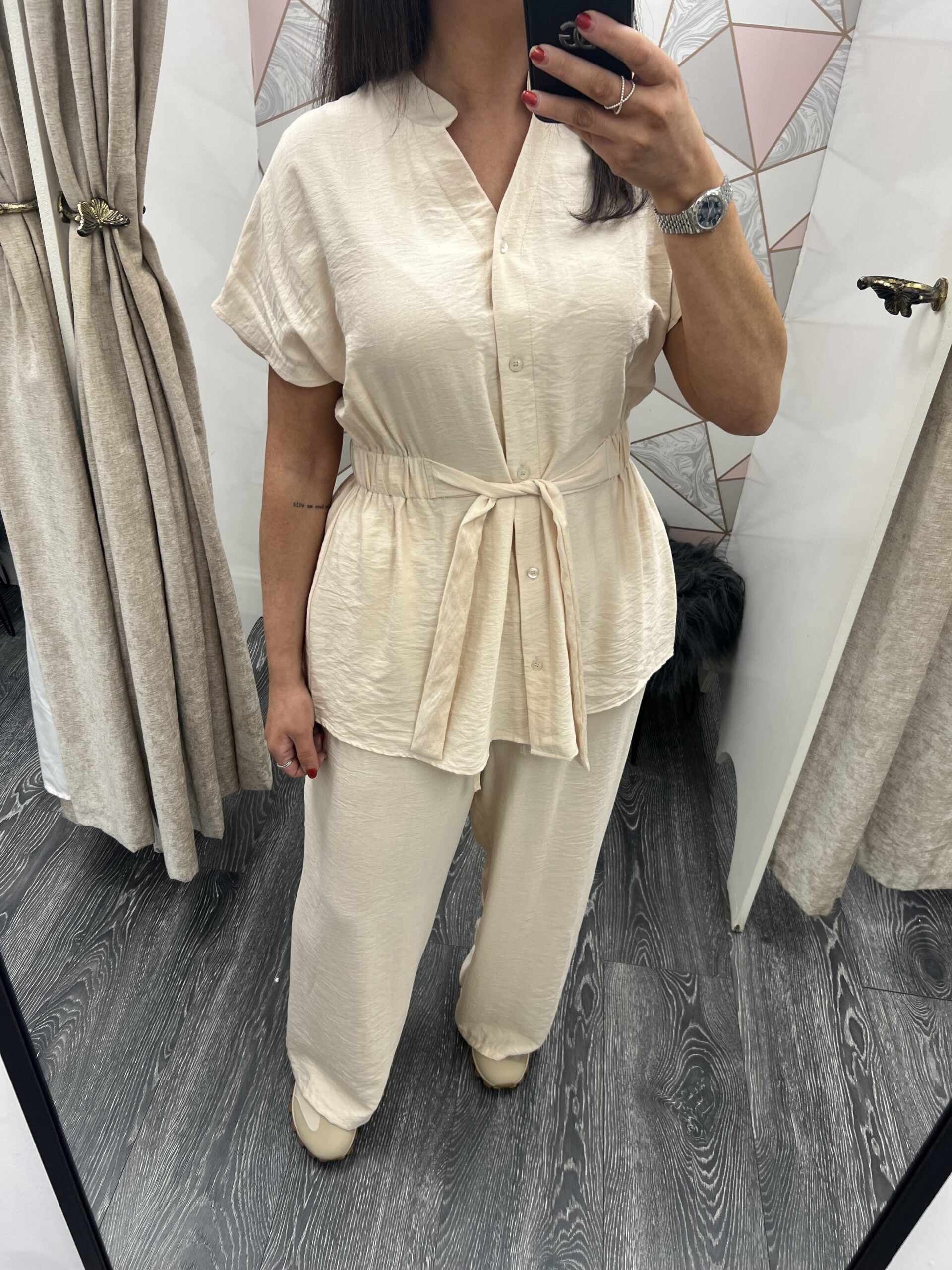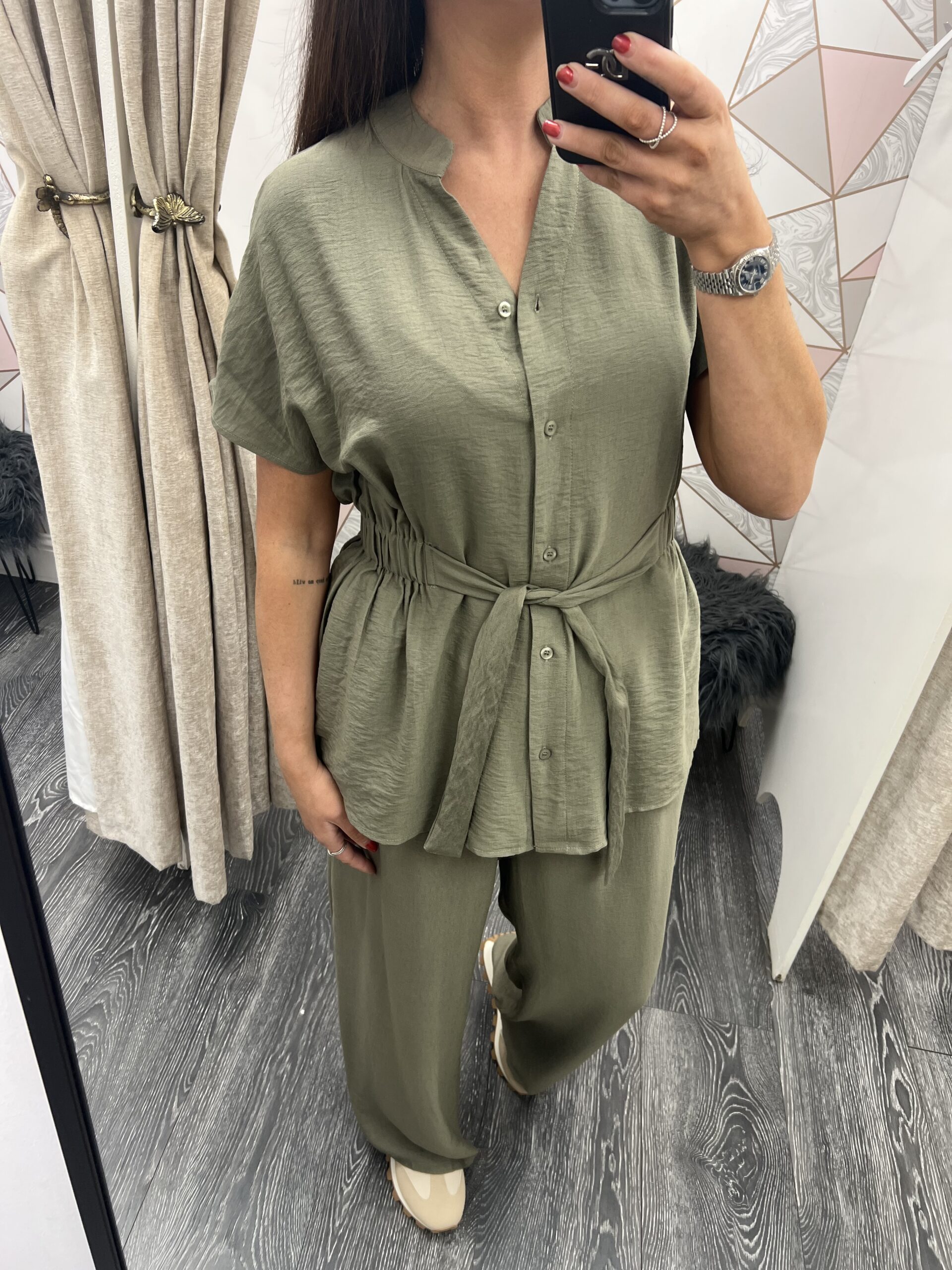 New season co ord available in chocolate, beige & khaki. Top features button front fastening, cap sleeves, collar & belted waistband (elasticated to back) for a comfortable fit. Trousers feature an elasticated waistband & pockets – Inside Leg