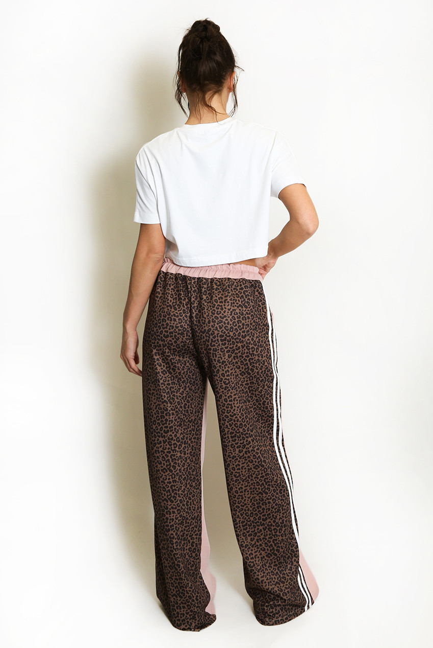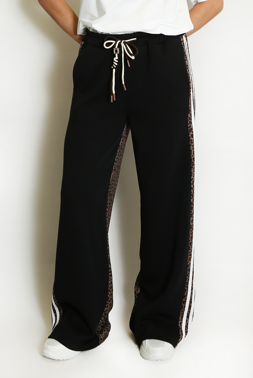 Trending leopard back joggers featuring elasticated waistband, pockets, self tie to front & side stripe.