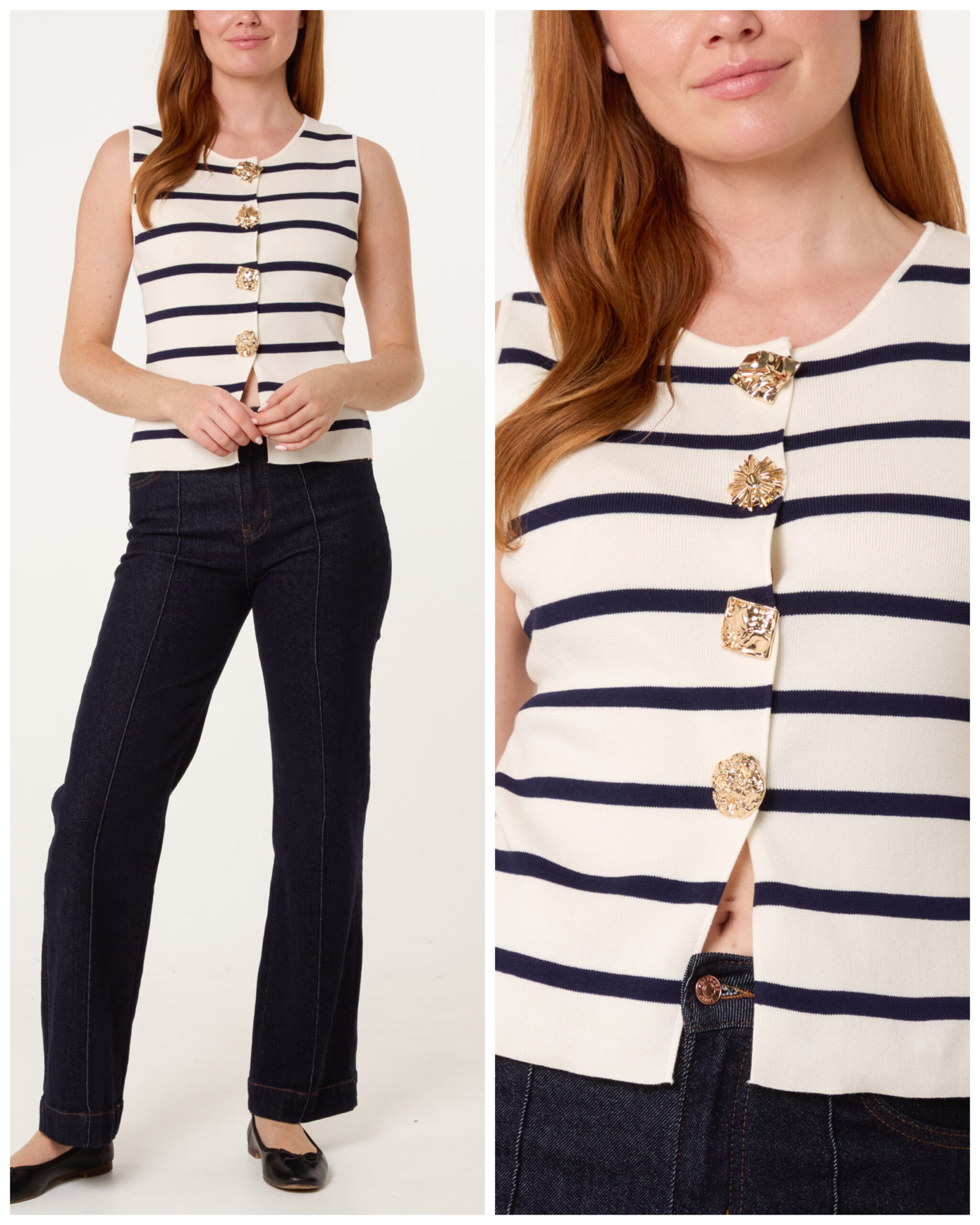 New season ivory and navy striped gold button vest top. Perfect teamed with jeans for a day to night look.