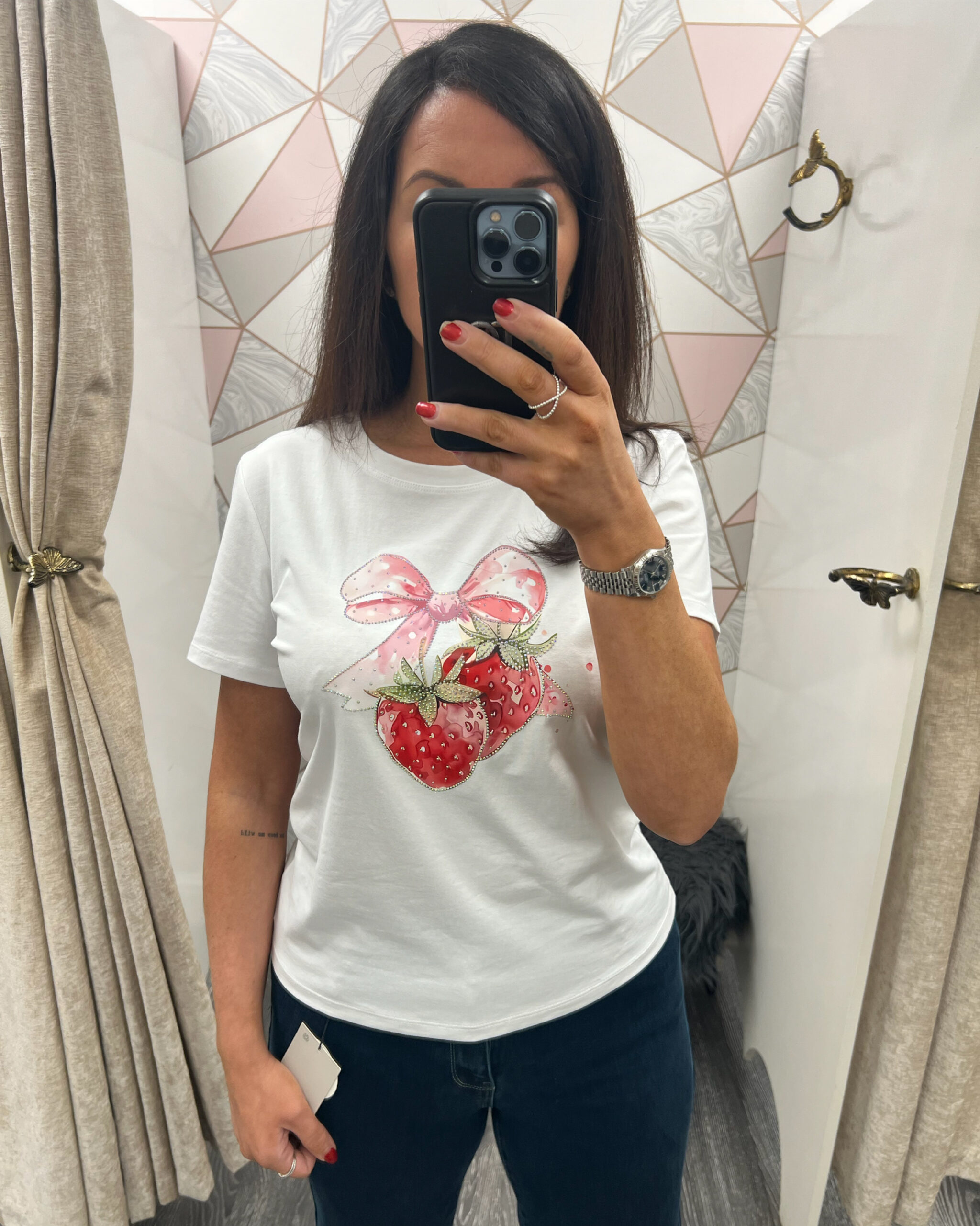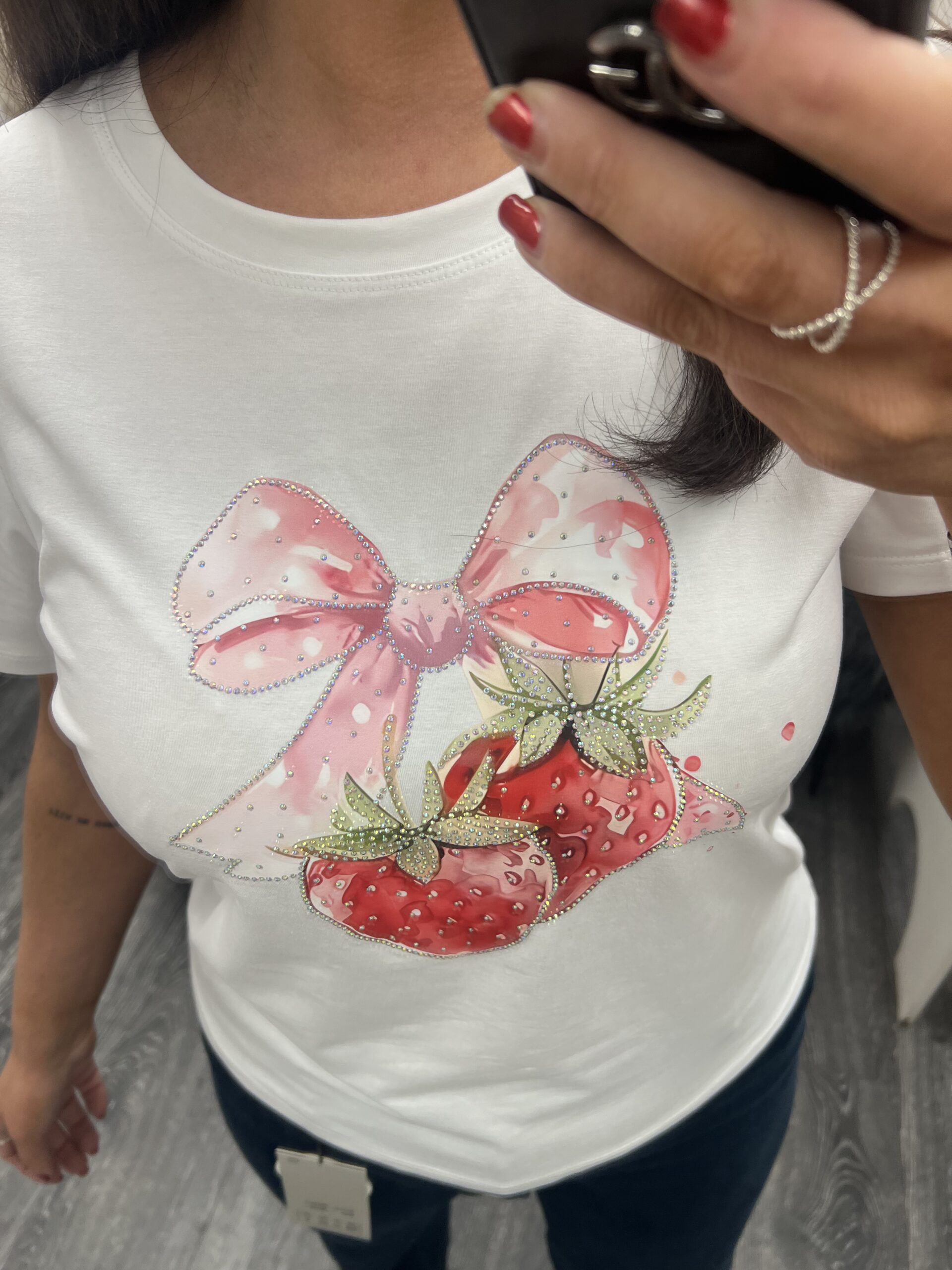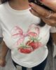 New season white tee featuring embellished strawberry & bow detailing to front, plain to back, cap sleeves & round neckline.