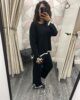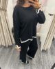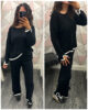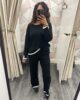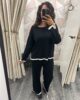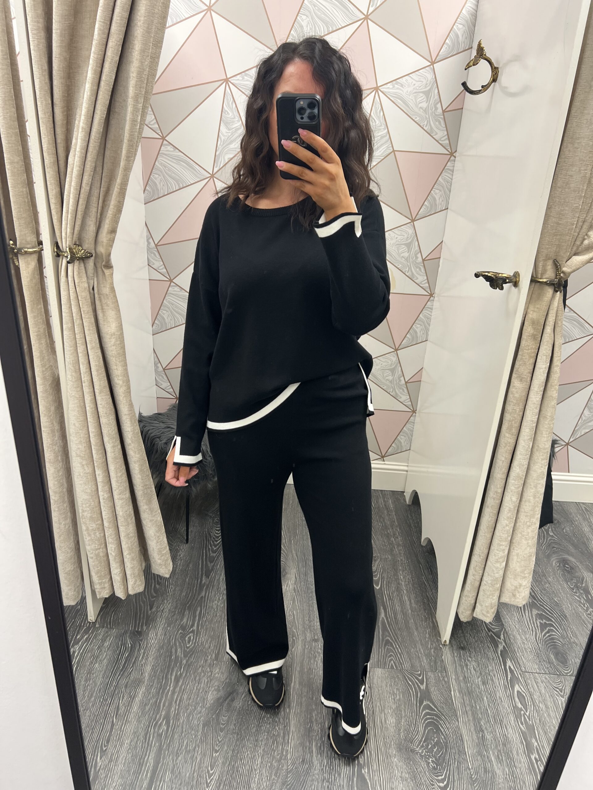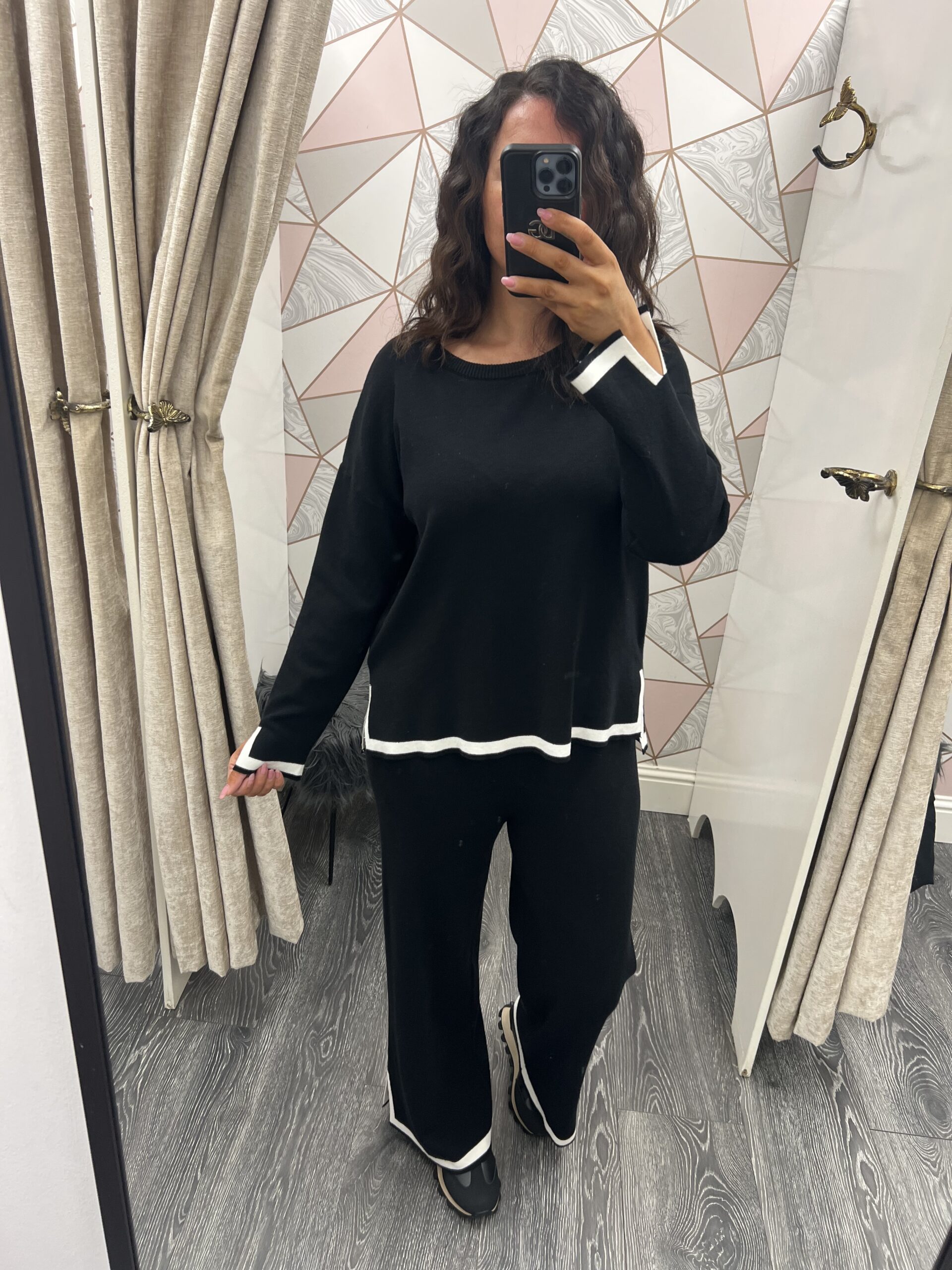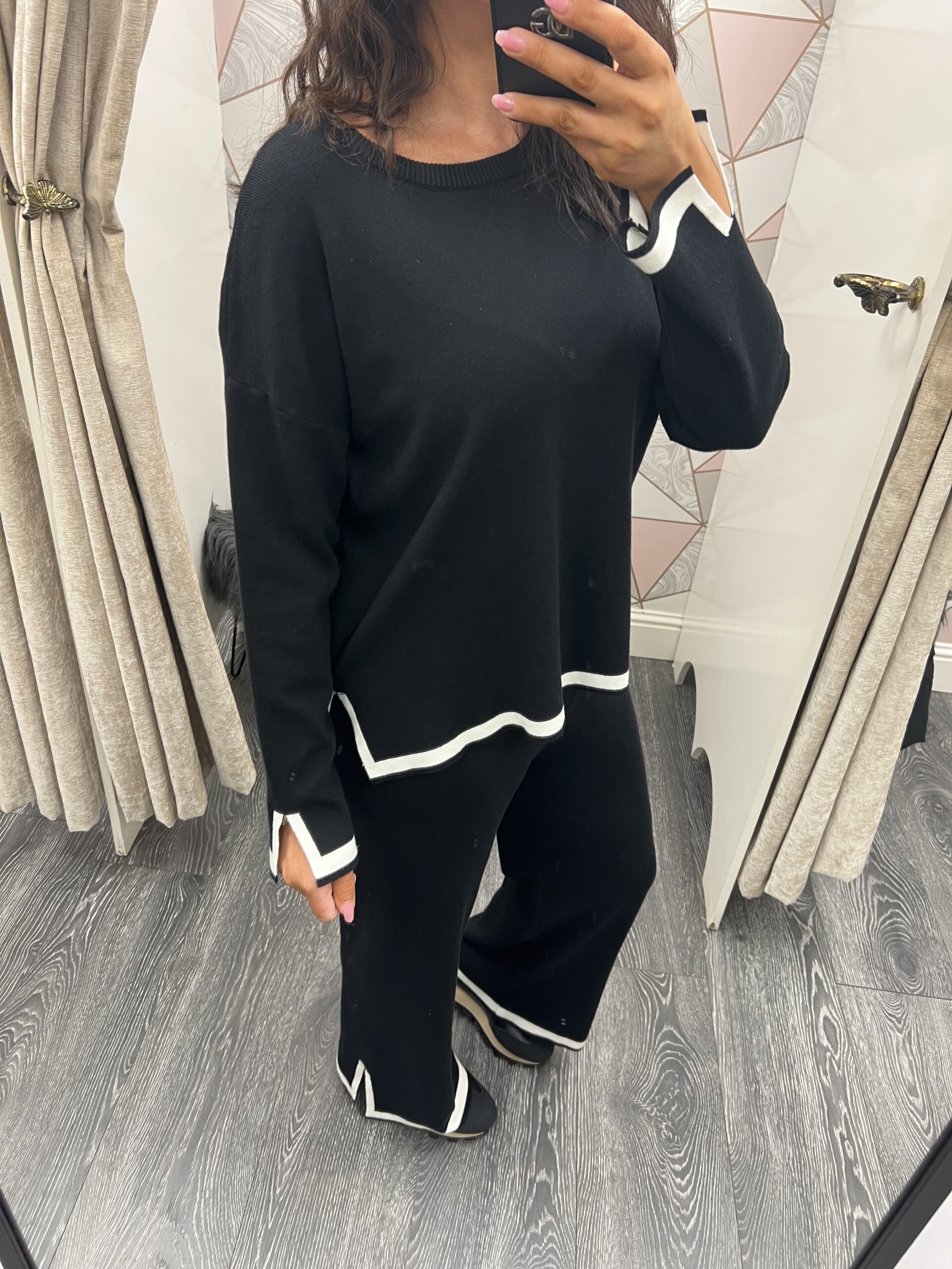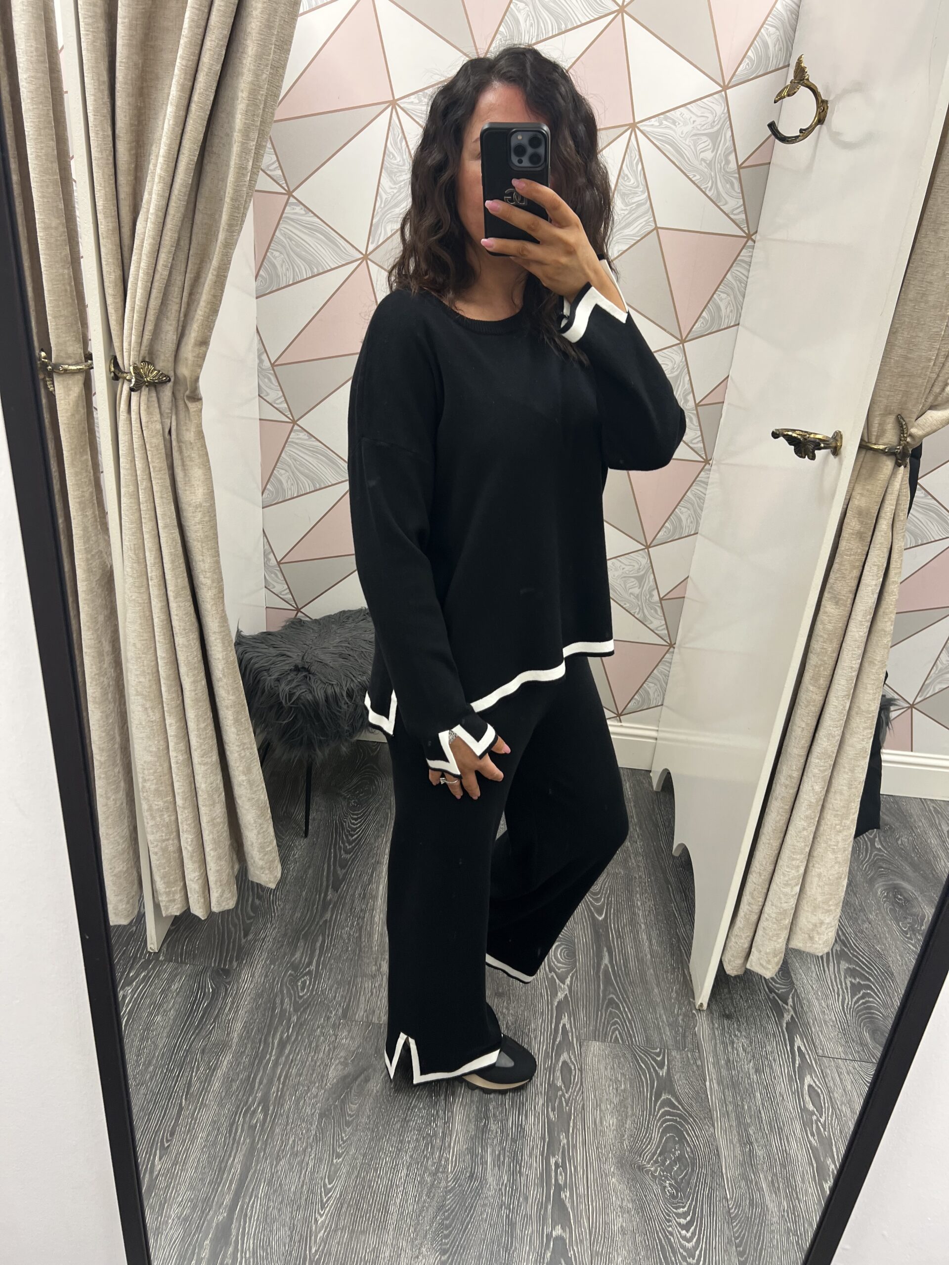 New season soft high quality knit feel co ord in black with white trim. Split sleeves & split trousers making it perfect teamed with trainers, heels or boots.